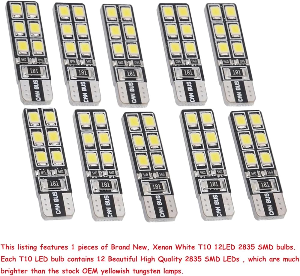 Each T10 LED bulb contains 12 Beautiful High Quality 2835 SMD LEDs , which are much brighter than the stock OEM yellowish tungsten lamps.