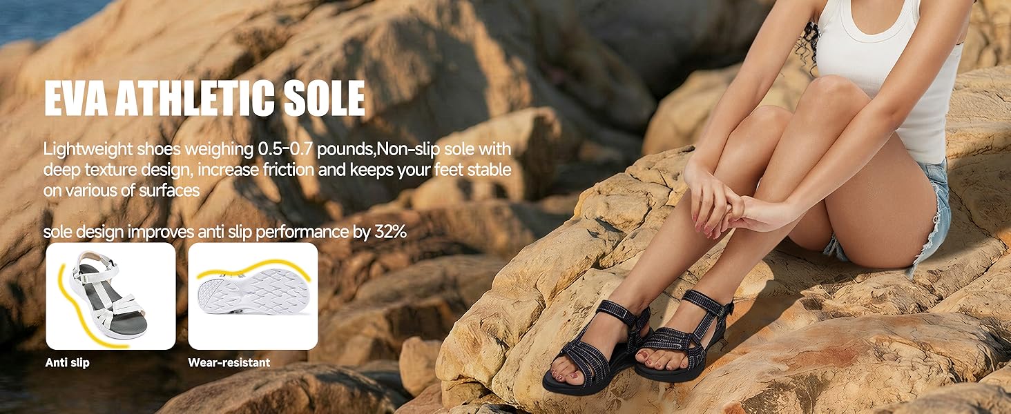 احتكاك مانع للانزلاق على جميع الأسطح: نعل خارجي متين بملمس عميق لقبضة فائقة. صنادل رياضية موثوقة تثق بها النساء على الأرض الرطبة أو الجافة. صنادل مريحة أساسية للنساء اللاتي يمشين في شوارع المدينة أو مسارات المشي لمسافات طويلة