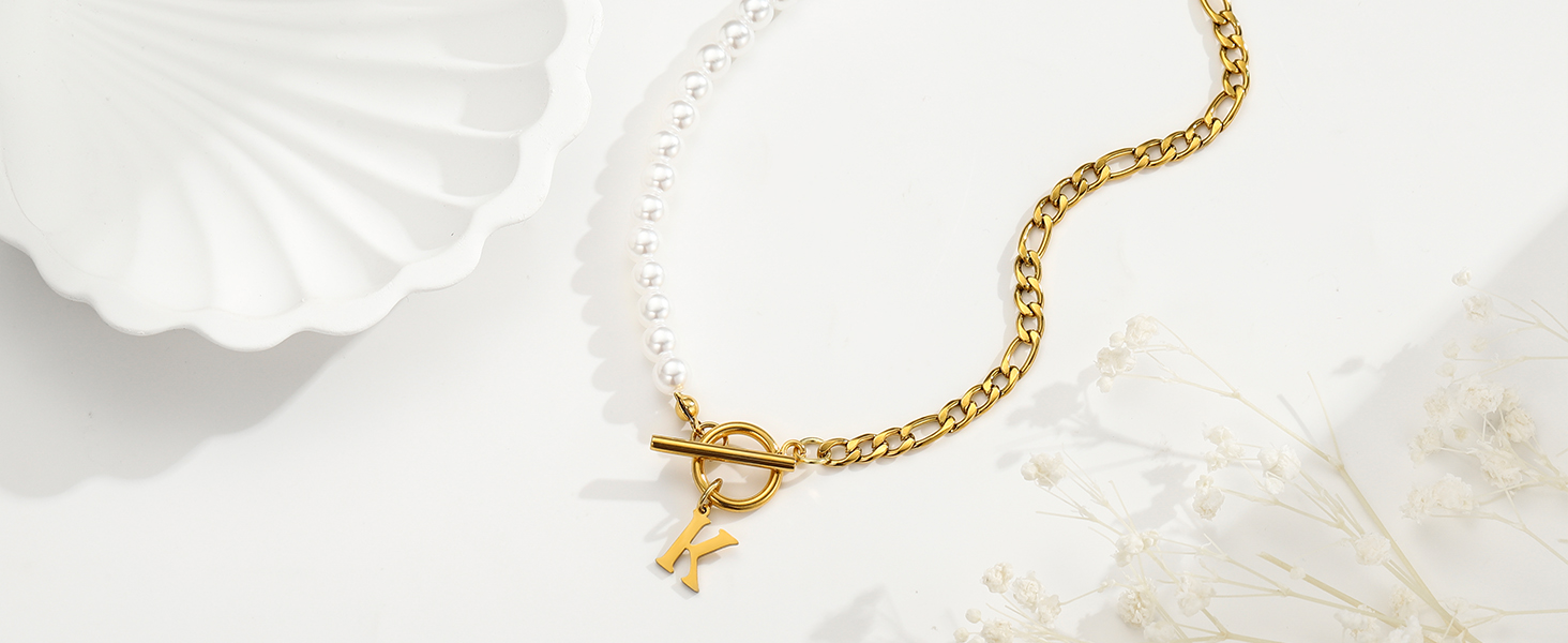تتميز قلادة الحروف الأبجدية هذه بتصميم فريد وجذاب يجمع بين سلسلة فيجارو العصرية واللؤلؤ اللامع. فهو يمزج بين الأناقة والموضة، ويضيف لمسة من الأناقة والأناقة إلى ملابسك اليومية أو إطلالاتك في المناسبات الخاصة. إنه يتماشى بشكل جميل مع أي ملابس.