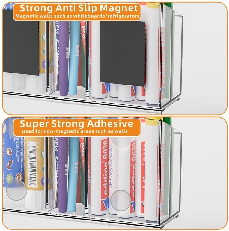 【Suitable for Any Surface】Our whiteboard marker holder is equipped with strong magnets and adhesives,It can be attached to various magnetic surfaces and comes with adhesive for wall mounting, ensuring that it can act on non-magnetic walls. Either way, you can quickly install and use it