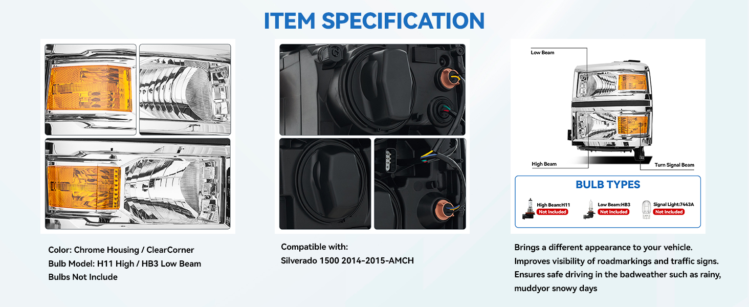 التوافق: متوافق مع سيارة بيك اب المصابيح الأمامية شيفروليه سيلفرادو 1500 2014 2015. رقم قطعة OEM: M2502389 GM2503389 GM2502395 GM2503395 GM2502410.