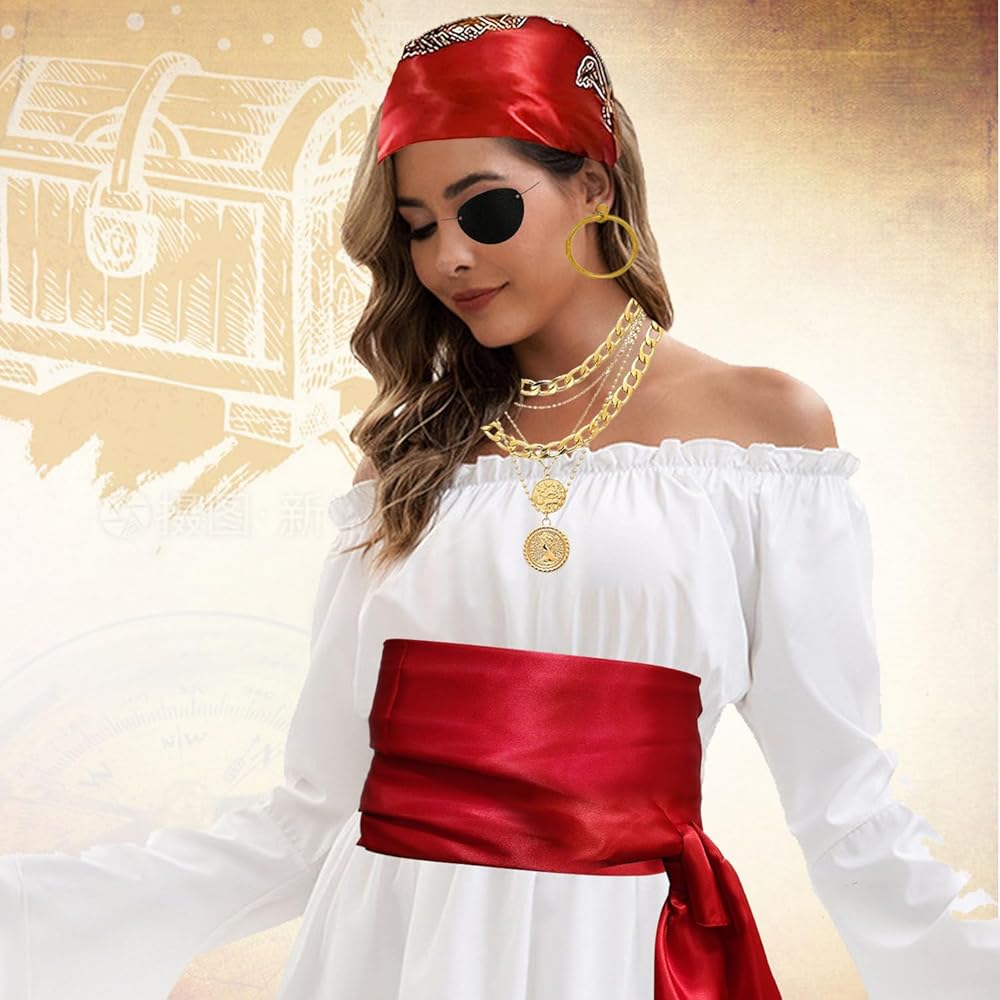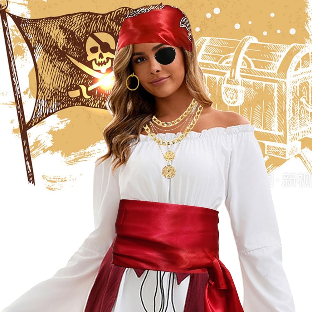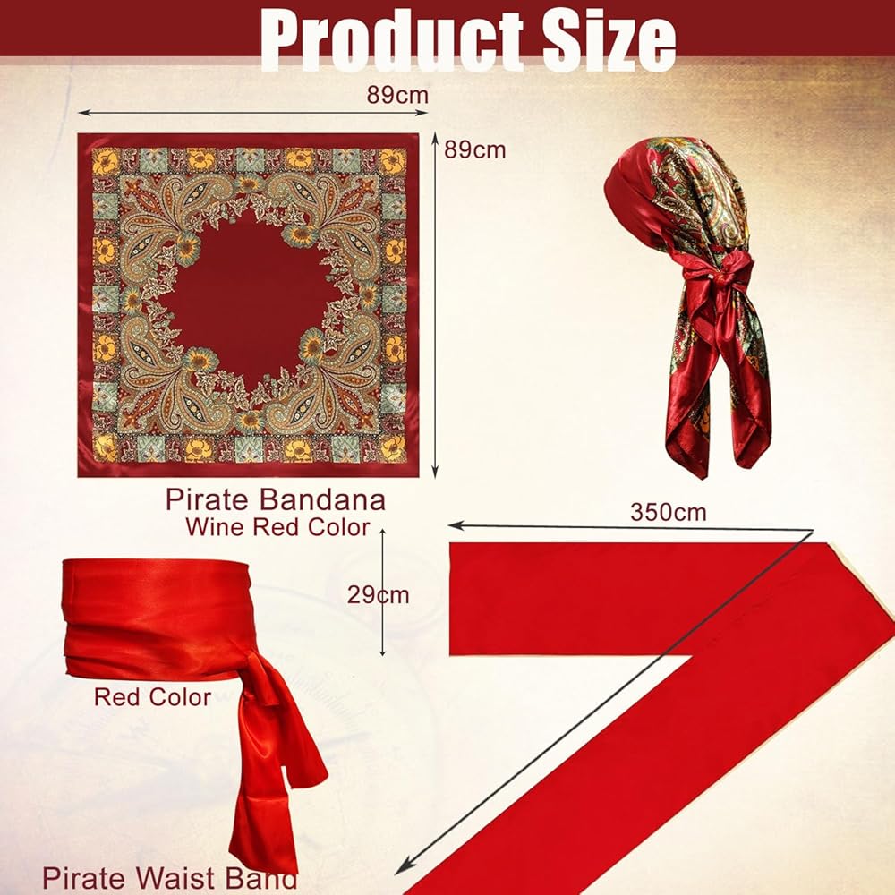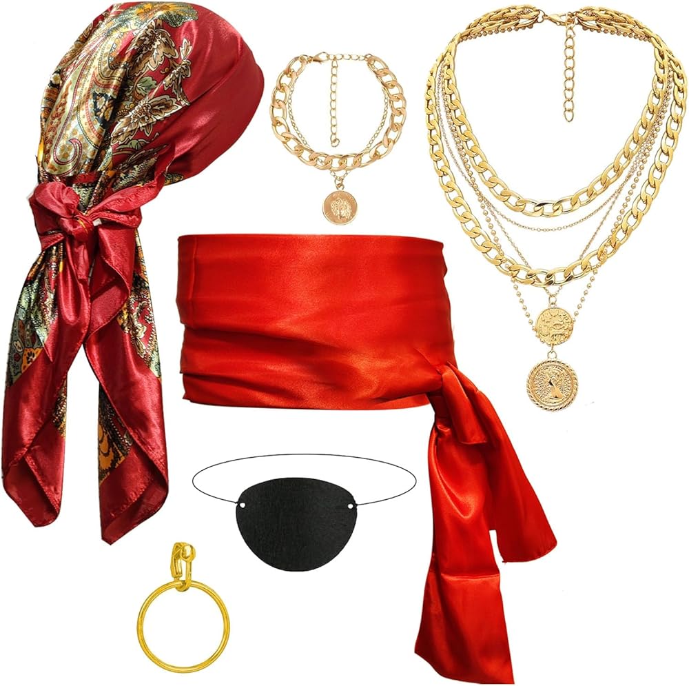 تتضمن الحزمة: قطعة واحدة من باندانا القرصان - أحمر نبيذي؛ قطعة واحدة من وشاح القرصان الكبير - أحمر؛ قطعة واحدة من رقعة العين - أسود؛ قطعة واحدة من القلادة - لون ذهبي؛ قطعة واحدة من السوار - لون ذهبي؛ 1 قطعة حلق-لون ذهبي؛
