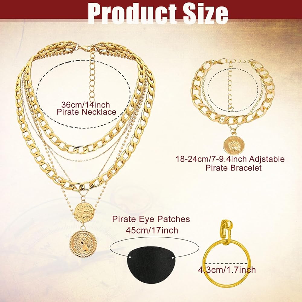 مواد فاخرة: يتميز وشاح رأس القرصان وحزامه بحرير بوليستر ناعم ومسامي مع طباعة كلاسيكية فريدة من نوعها من أجل نمط أصلي؛ يستخدم قناع العين لبادًا فخمًا وشريطًا مطاطيًا مطاطيًا لتوفير الراحة الآمنة أثناء المغامرات؛ تتميز الأقراط والقلادة والسوار بهيكل معدني ذهبي قوي مع سلاسل متعددة الطبقات من أجل ذوق القرصان المتين؛ بينما تضمن الأقراط البلاستيكية خفيفة الوزن ارتداءً مريحًا طوال اليوم دون التضحية بالسحر القوي.