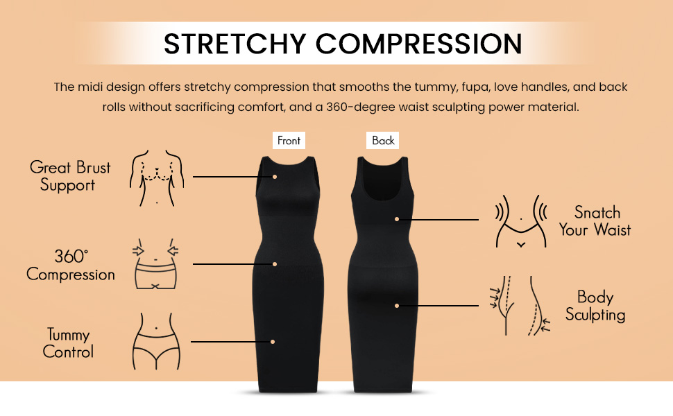 • فستان مناسب لشكل الجسم: مصمم مع ضغط مدمج للتحكم في البطن بزاوية 360 درجة وحمالة صدر، مما يعمل على تنعيم المناطق غير المرغوب فيها مثل البطن والفوبا ومقابض الحب ولفائف الظهر.