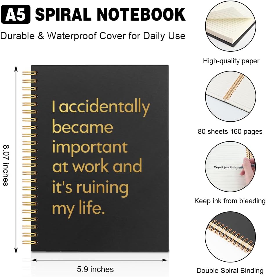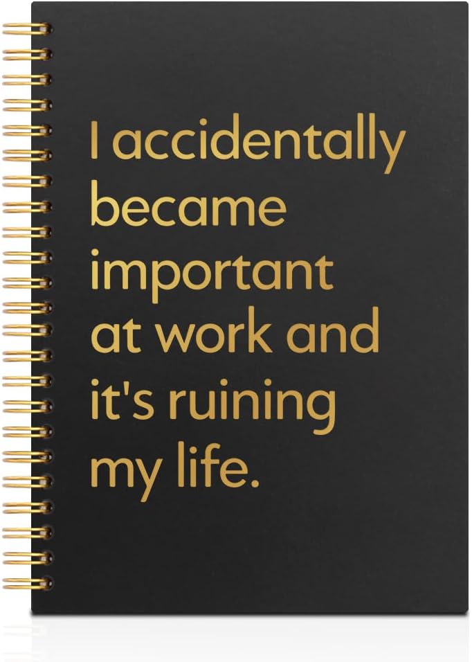 لقد أصبحت عن طريق الخطأ مهمًا في العمل دفتر ملاحظات حلزوني مبطن باللون الأسود والذهبي الأفقي، هدايا دفتر ملاحظات حلزونية مضحكة لتخفيف التوتر لزملاء العمل ومدير فريق العمل، مجلة مكتب ساخرة