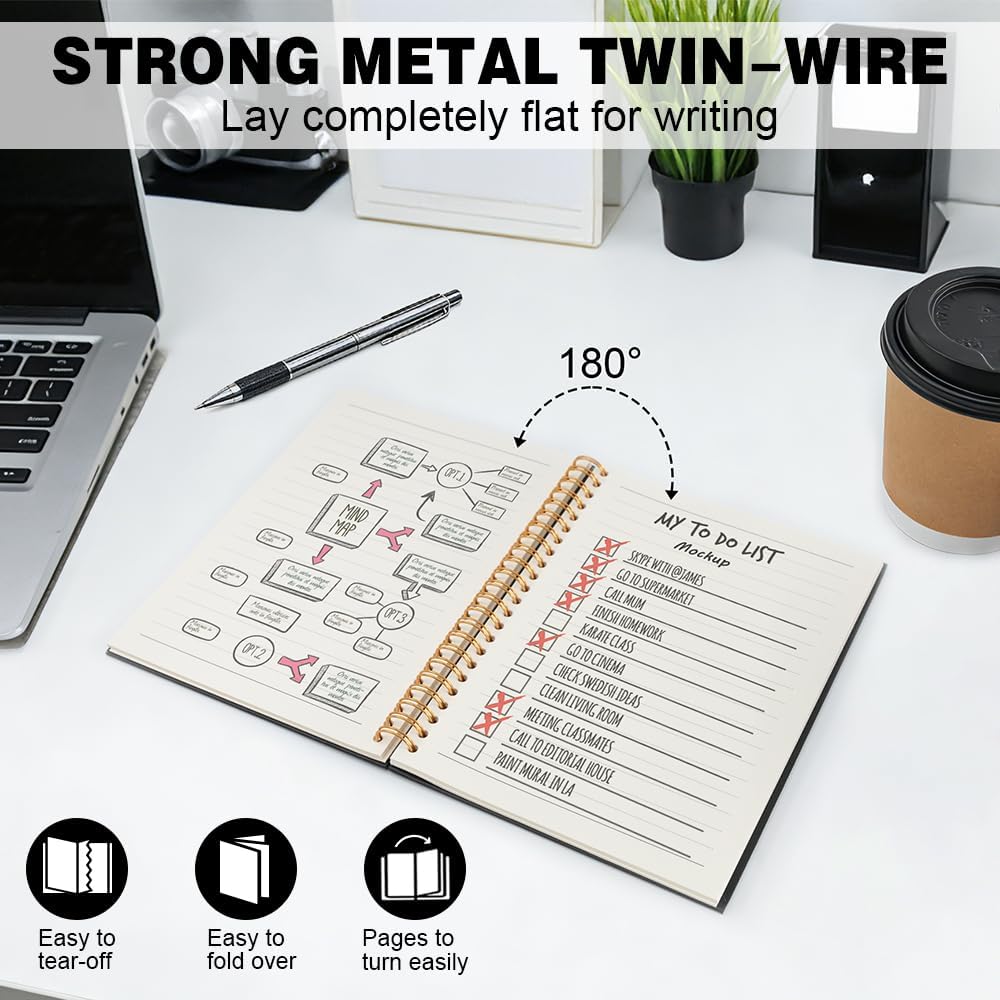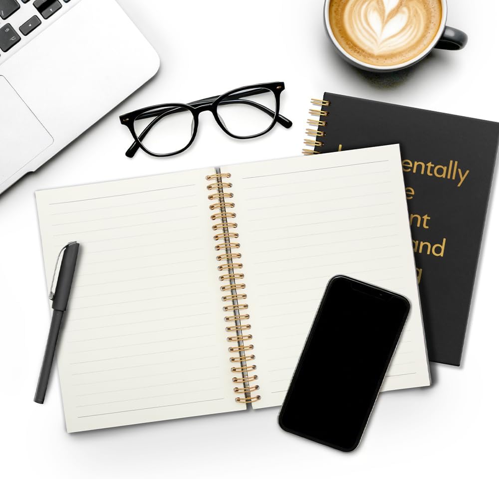 This black and gold A5 spiral-bound lined notebook features a simple yet sophisticated black and gold design and a durable hard cover, making it suitable for various uses such as office work, business meetings, and study planning. Measuring 5.9 inches x 8 inches (standard A5), it's portable and space-saving. It contains 160 pages (80 sheets) of cream-colored lined paper, providing a smooth and comfortable writing experience. The double-wire spiral binding allows for a 180° flat opening, ensuring smooth page turning without any snags. It's an excellent companion for improving work and study efficiency.