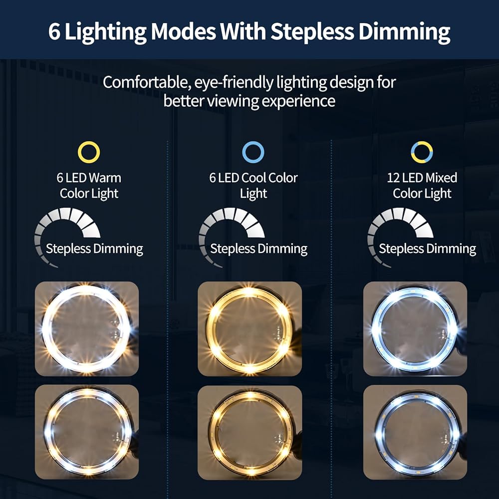 【مصابيح LED ساطعة】 مجهزة بـ 12 مصباح SMD LED كبير و6 أوضاع ألوان (بارد 15000 كلفن، دافئ 3000 كلفن، مختلط 8000 كلفن) مع تعتيم بدون خطوات. مثالية للحرف اليدوية أو القراءة الليلية. يمكن تعديل السطوع بسهولة ليناسب عينيك والبيئة