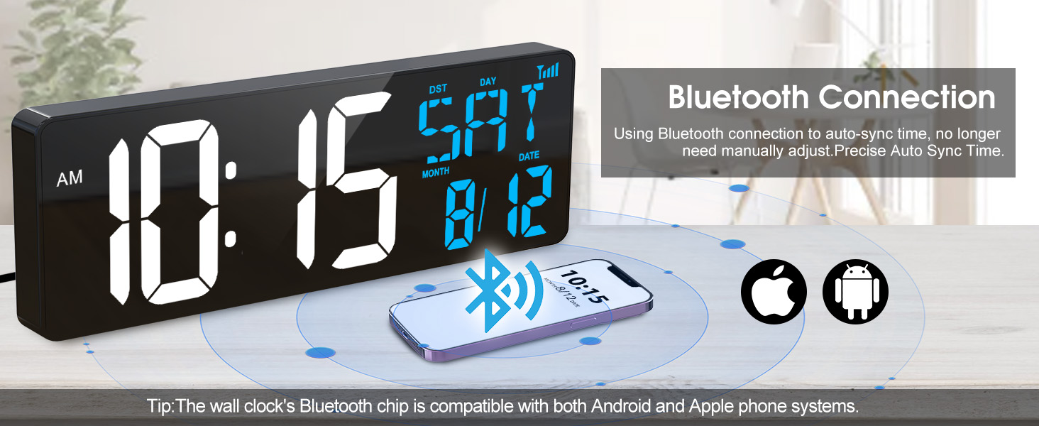 【مزامنة وقت البلوتوث التلقائية】- تتصل ساعة الحائط الرقمية الجديدة تلقائيًا بهاتفك الذكي عبر البلوتوث وتتزامن مع إعدادات الوقت الحقيقي كل يوم. فهو يوفر دقة فائقة دون الحاجة إلى تعديلات يدوية، مما يجعل إعداد الوقت بسيطًا بشكل لا يصدق.