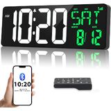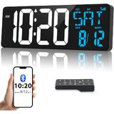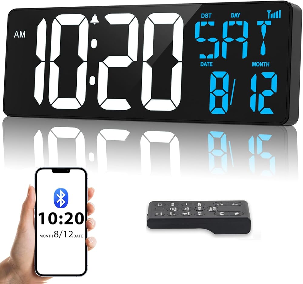 ساعة حائط رقمية كبيرة مقاس 17 بوصة مع مزامنة بلوتوث وجهاز تحكم عن بعد ومنبه LED كبير ودرجة حرارة التوقيت الصيفي التلقائي لغرفة النوم والمرآب وصالة الألعاب الرياضية