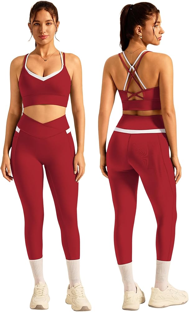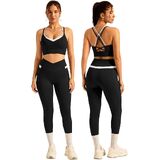 Women's Breathable Yoga Outfits Compression Padded Contrast Panel Sports Bra and Cross-over Waist Butt-lifting Pants with Pockets Active Jogger Outfits