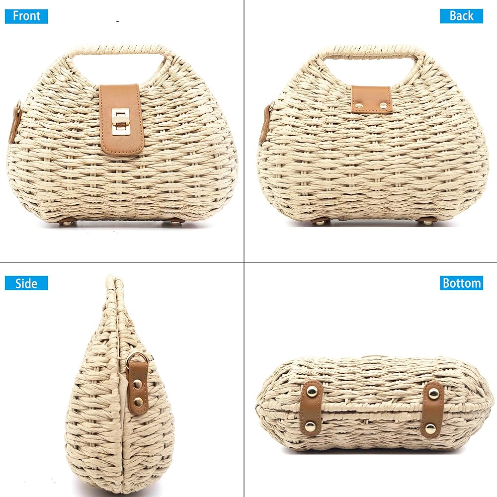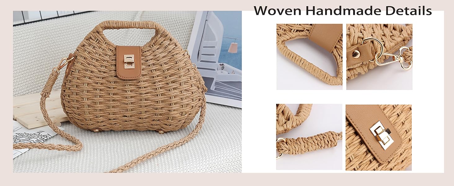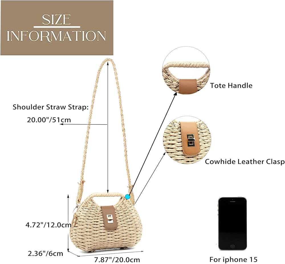 خفيفة الوزن وواسعة: مصنوعة من القش الطبيعي الفاخر ومادة الحبال الورقية، خفيفة الوزن للحمل (0.88 رطل فقط) مع توفير مساحة كافية للهاتف والمحفظة والنظارات الشمسية وغيرها من الضروريات الصغيرة.