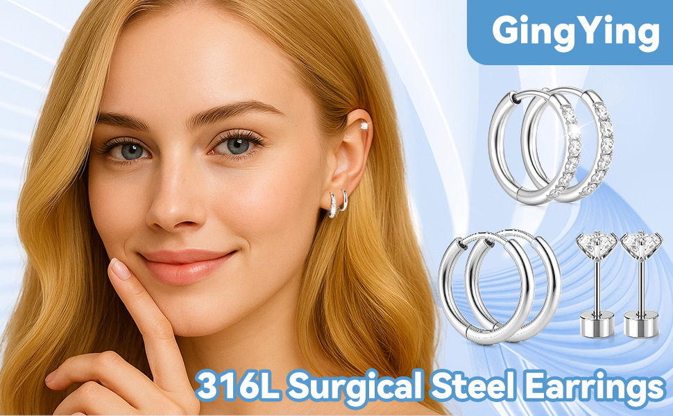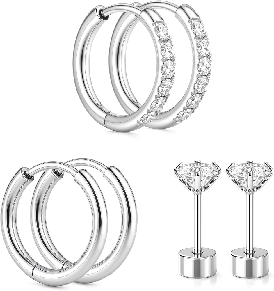 Hypoallergenic earrings set: One package includes a pair of flat back CZ stud earrings(4mm), a pair of small hoop earrings(8mm), and a pair of cubic zirconia hoop earrings(10mm), which all made of surgical stainless steel, hypoallergenic for sensitive ears, no allergy, no irritation, nickel and lead free, no rust and no tarnish, Smooth surface, comfortable to wear