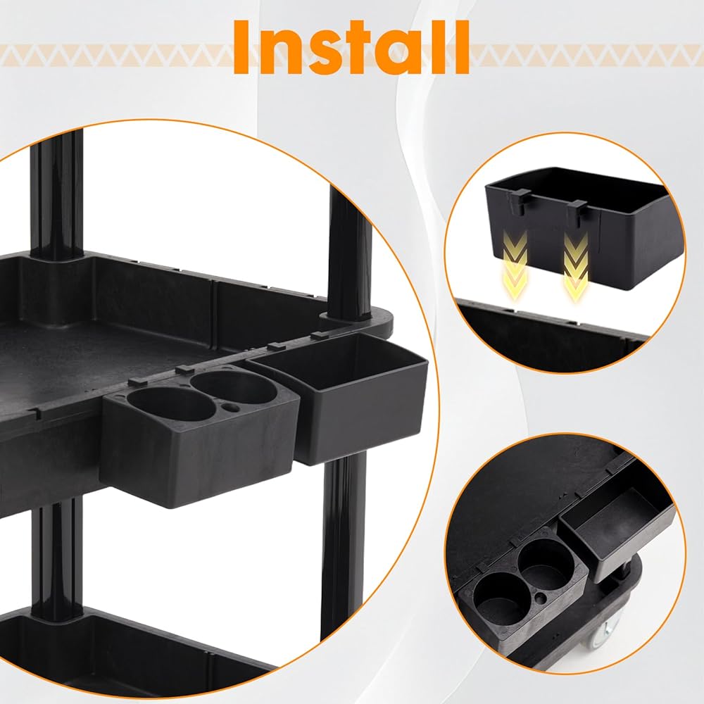 Upgrade your ELAFROS Utility Cart with this 2-piece accessory kit, designed to expand your storage options and improve efficiency. The set includes a multi-use hanging box, ideal for holding tools, fasteners, or small parts, and a dual bottle holder, perfect for cleaning sprays or beverage bottles. Both accessories are crafted from the same rugged polypropylene material as the cart itself, ensuring long-lasting use in any environment. They attach easily via the built-in hanging slots—no tools or hardware required. Whether you're working in maintenance, cleaning, IT, education, or logistics, this organizer set helps you stay tidy, efficient, and ready for the job.