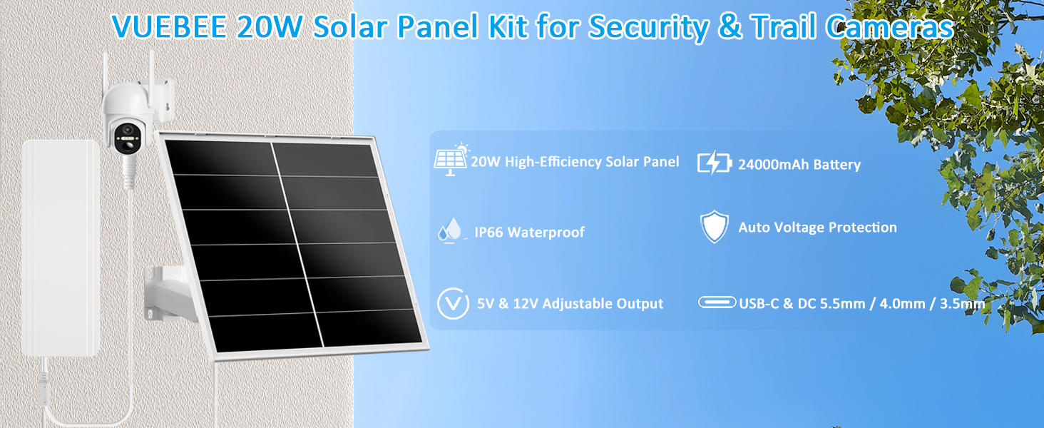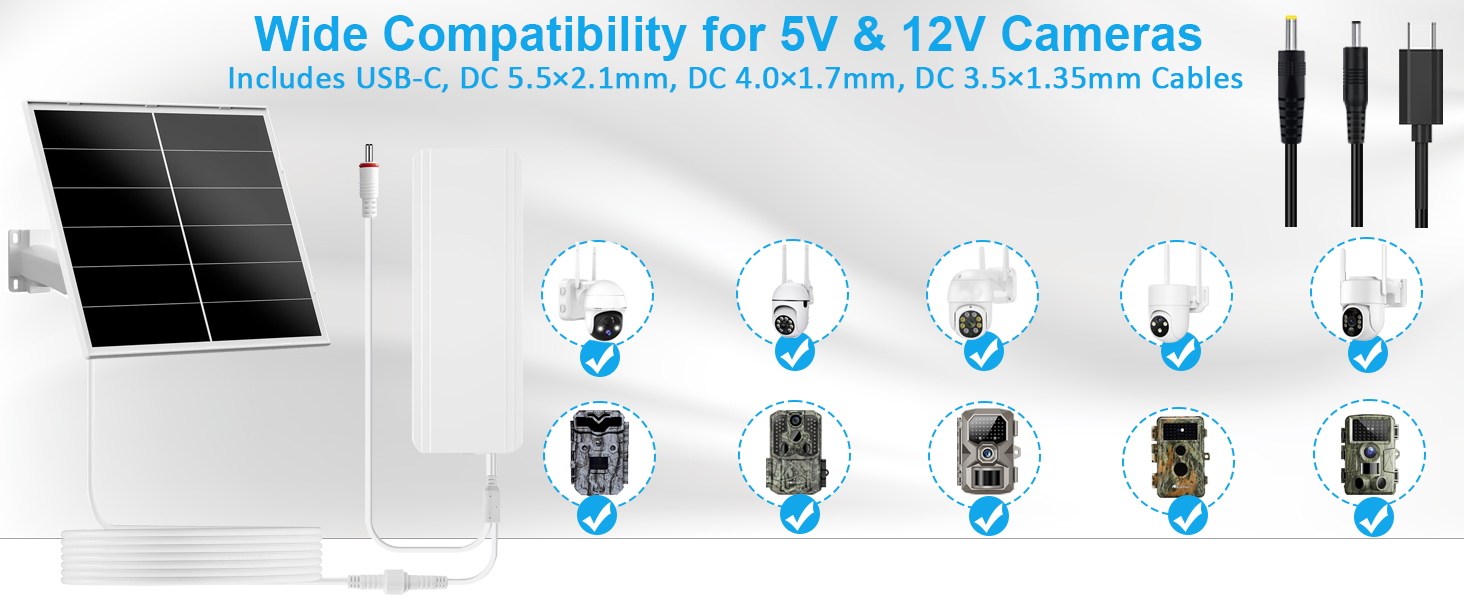 توافق واسع لكاميرات 5 فولت و12 فولت: تأتي مجموعة الألواح الشمسية VUEBEE 20 واط مع بطارية 24000 مللي أمبير في الساعة وتدعم كلاً من مخرج USB-C وDC، مما يجعلها متوافقة مع معظم كاميرات الأمان 5 فولت وكاميرات المسار الخلوية 12 فولت. يتضمن مقابس DC 5.5x2.1mm و4.0x1.7mm و3.5x1.35mm وكابل USB-C ليناسب المنافذ المختلفة. ملحوظة: يمكن استخدام مخرج واحد فقط في كل مرة.