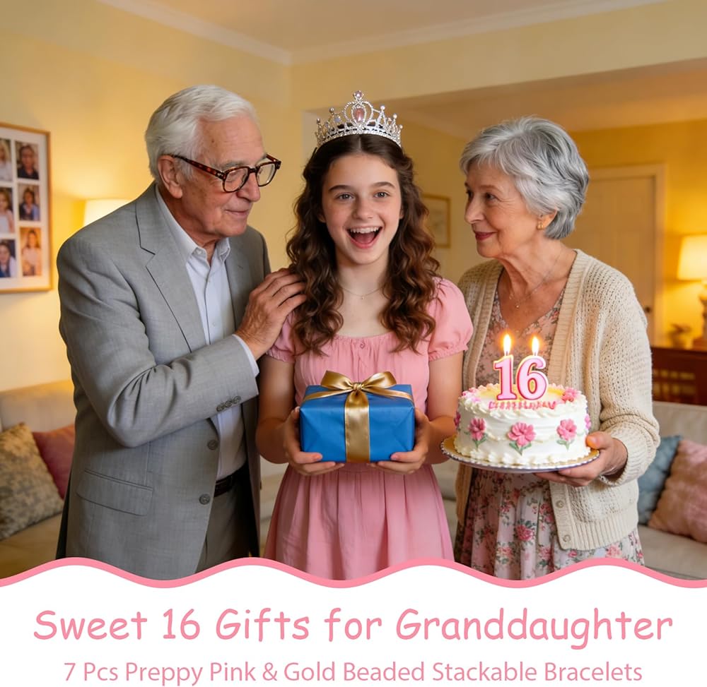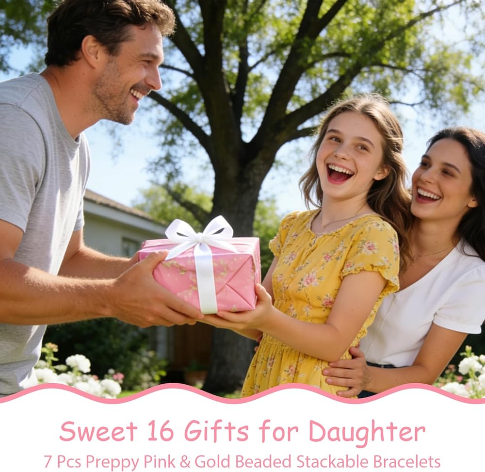 16 هدية حلوة لحفيدة الابنة، 7 قطع أساور قابلة للتكديس مطرزة باللون الوردي والذهبي، تذكار عيد ميلاد جميل للشابات، هدايا مجوهرات عيد الميلاد السادس عشر