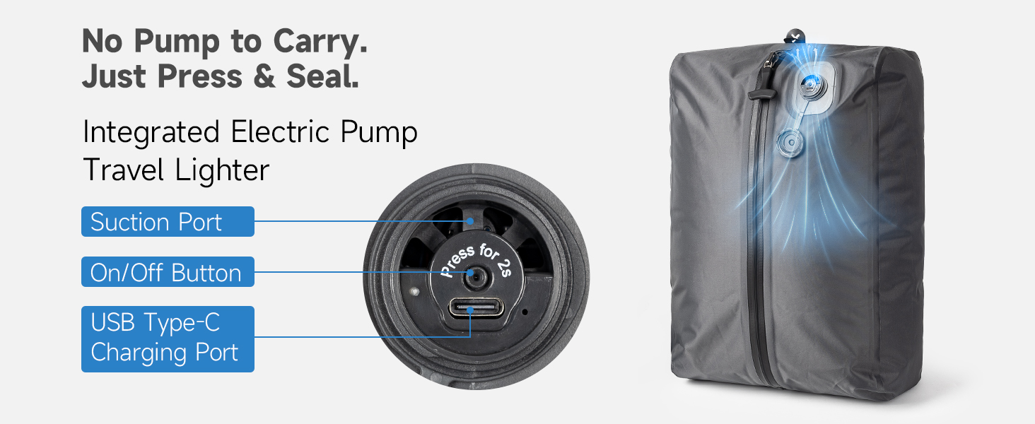[نظام ضغط مكنسة كهربائية قابل للفصل] تتميز حقيبة السفر هذه بحقيبة مكنسة كهربائية قابلة للفصل ومؤمنة بشريط فيلكرو مدمج، مما يسمح لك بإرفاقها أو إزالتها حسب الحاجة. تبقى حقيبة الظهر الهوائية في مكانها لاستخدام خالٍ من المتاعب. باستخدام مضخة التفريغ الكهربائية المتضمنة، يمكنك ضغط الحقيبة أو نفخها بسهولة، مما يوفر المساحة الأمثل مع الحفاظ على متعلقاتك منظمة بشكل أنيق.