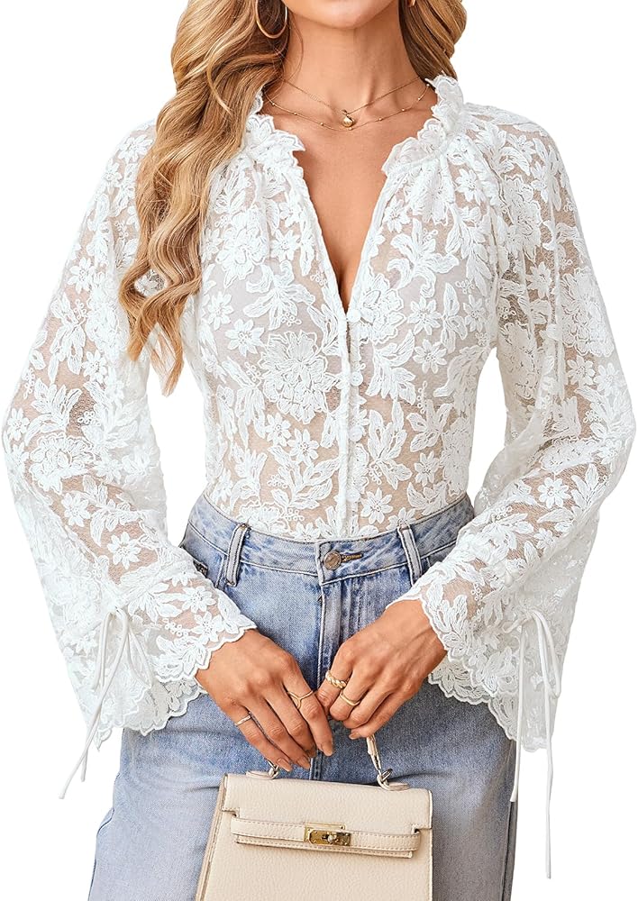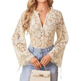 ميزات رائعة: يتميز قميص الدانتيل الخاص بنا للسيدات بنمط كروشيه من الدانتيل الزهري الرائع، وأكمام طويلة، ورقبة عميقة على شكل حرف V، وألوان فضفاضة وصلبة. الدانتيل المطرز يخلق رؤية شفافة، وهو مثير للغاية.