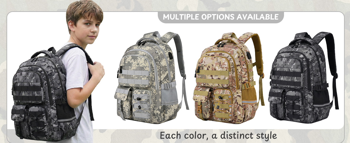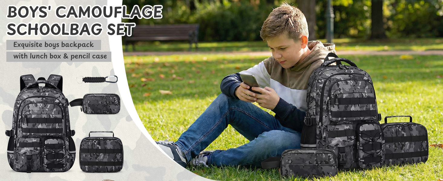 【حقيبة ظهر مموهة متعددة الاستخدامات لجميع المناسبات】تم تصميم حقيبة الظهر هذه للأولاد خصيصًا للأولاد في المدارس الابتدائية والمتوسطة والثانوية، وهي مثالية للحياة اليومية في الحرم الجامعي ومجموعة واسعة من المغامرات الخارجية بما في ذلك السفر والتخييم والمشي لمسافات طويلة. بفضل المظهر الجذاب والتصميم الفريد من نوعه، تعد حقيبة ظهر الأطفال هدية مدروسة ومثيرة للإعجاب للأطفال والأصدقاء والجيران. إنها تعمل بشكل رائع كهدية للعودة إلى المدرسة، ورأس السنة، وعيد الميلاد وأعياد الميلاد.