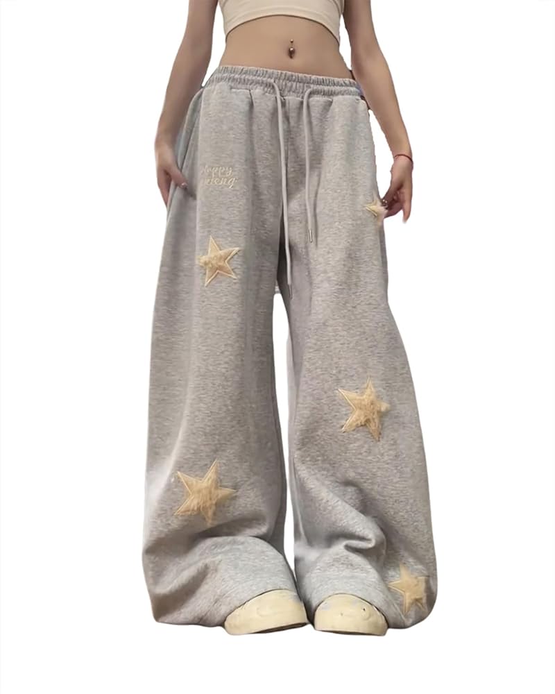 PDLCVD بنطلون رياضي فضفاض مزين بالنجمة للسيدات بنطلون رياضي فضفاض Y2K غير رسمي فضفاض واسع الساق مع جيوب