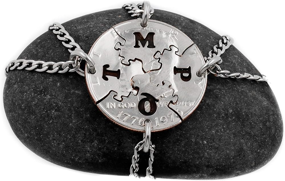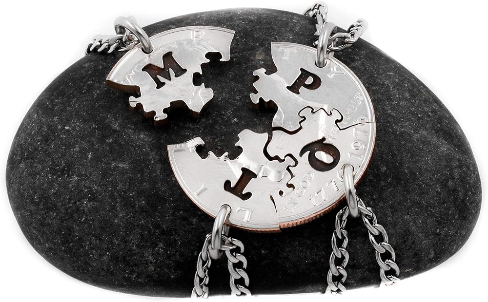 مجموعة قلادات مكونة من 4 قطع ألغاز مع الأحرف الأولى المخصصة، وهدايا BFF، وقطع الصور المقطوعة، وهدية أفضل الأصدقاء، وعملة متشابكة مقطوعة يدويًا، حسب NameCoins