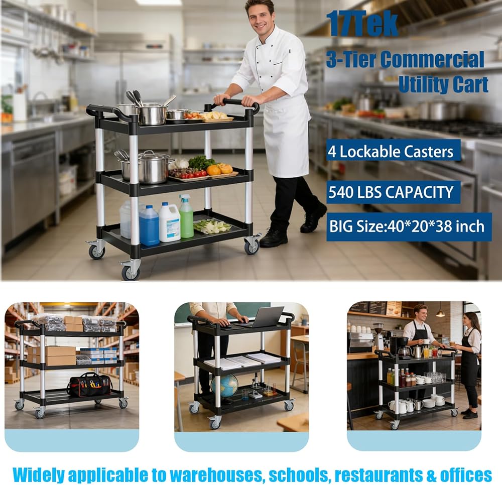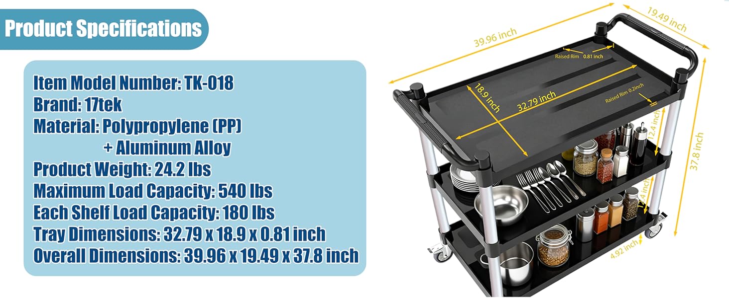 【عربة مرافق بوزن 540 رطلًا من 3 طبقات - حل للتخزين والنقل متعدد المشاهد】 هذه العربة الدوارة المكونة من 3 طبقات كبيرة الحجم، ومصممة للمطابخ والمطاعم والمكاتب والجراجات، مما يزيد من مساحة التخزين مع سهولة الحركة، مما يوفر الوقت والمساحة والجهد البدني. يمكنه دعم ما يصل إلى 540 رطلاً (180 رطلاً لكل طبقة)، مما يجعله مثاليًا لتخزين ونقل العناصر في المستودعات والمكاتب والمطاعم والفنادق والمطابخ والساحات والمزيد. أبعاد سطح العمل الفعالة: 32 بوصة طول × 18 بوصة عرض × 12.4 بوصة ارتفاع.