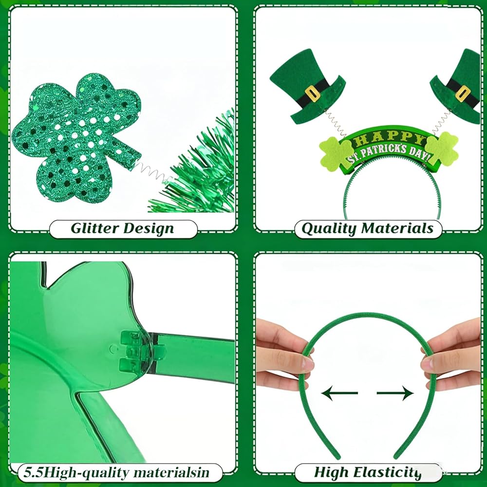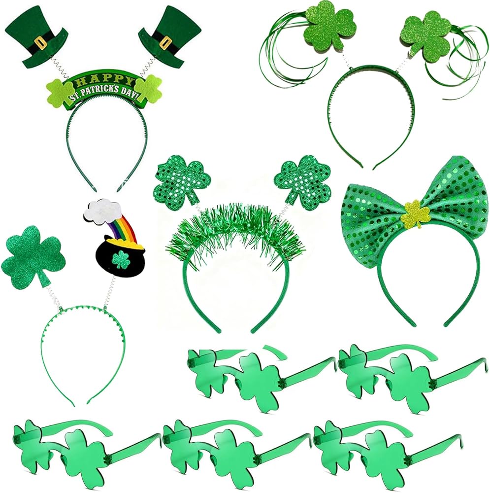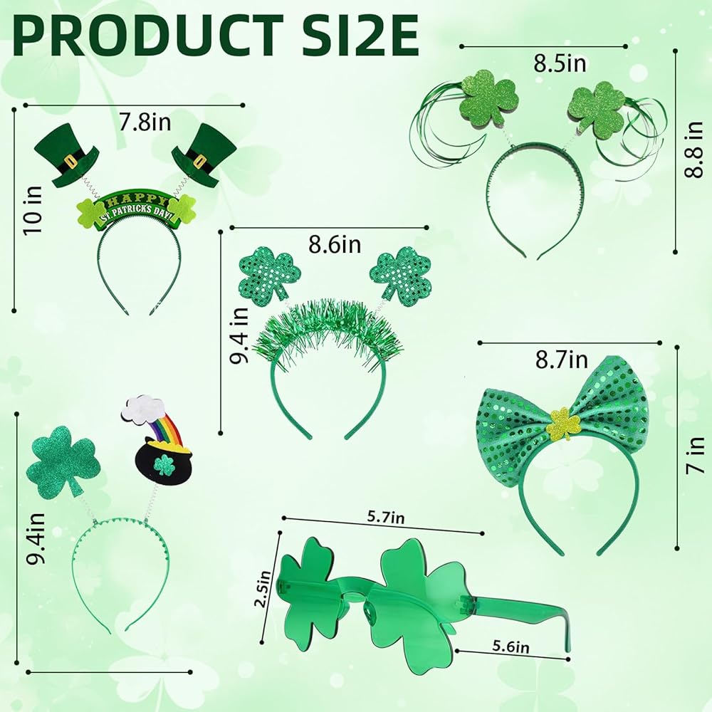 Festive 10-Piece St. Patrick's Day Accessories Set:This value-packed set includes 5 pairs of st patricks day glasses (charming shamrock sunglasses) and 5 st patricks day headbands (stylish shamrock headband designs), covering glitter clover, green bow, and hat styles. As essential st patricks day accessories, it's ideal for gifting at St. Patrick's Day parties, parades, or Irish-themed events—spreading festive cheer to friends and family.