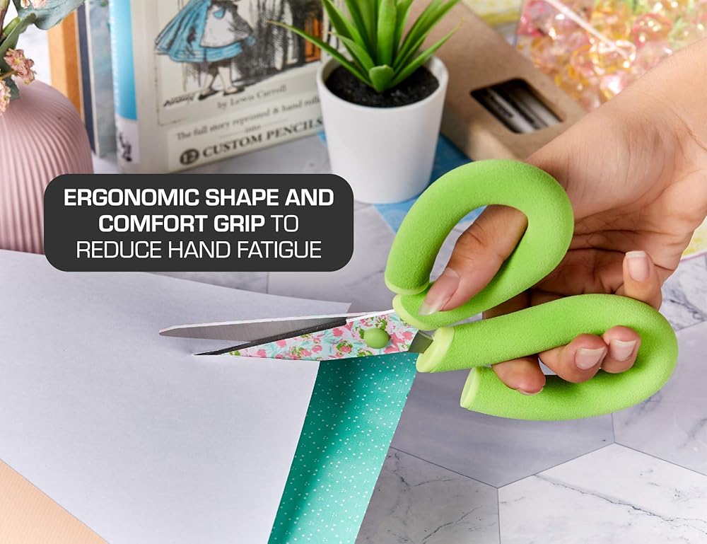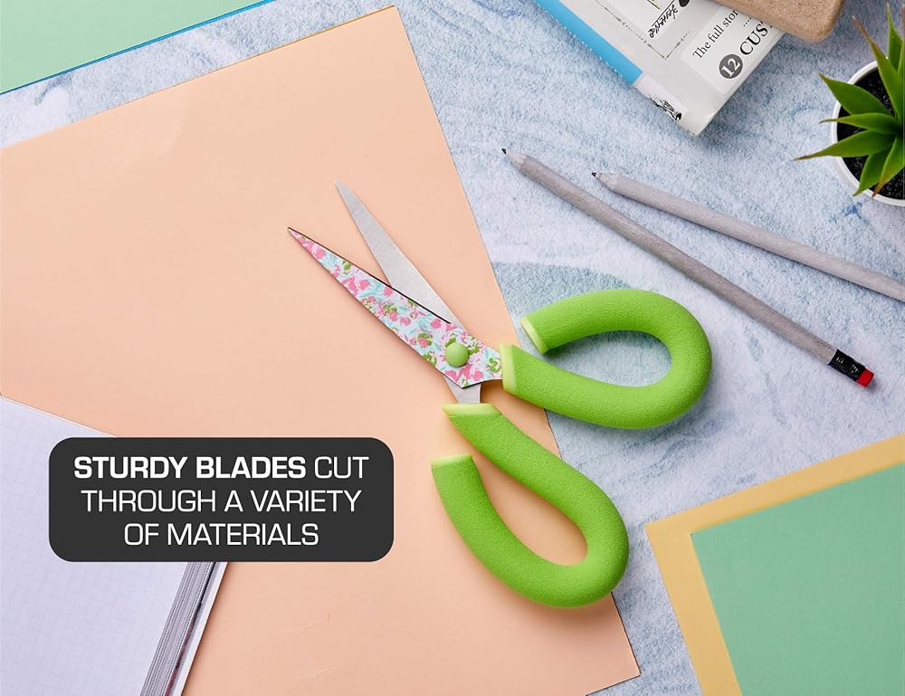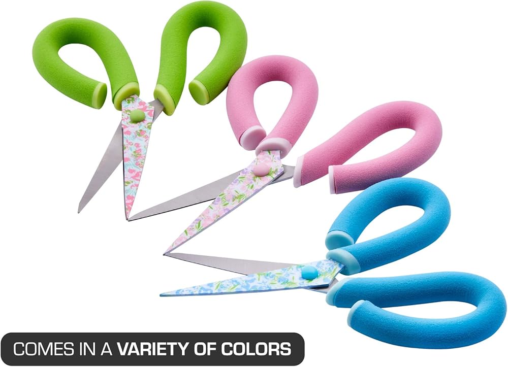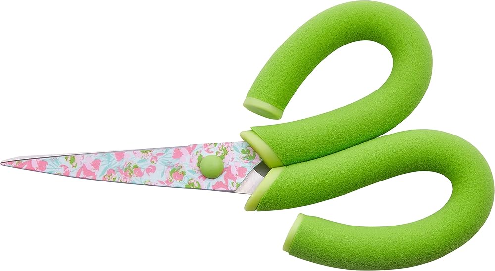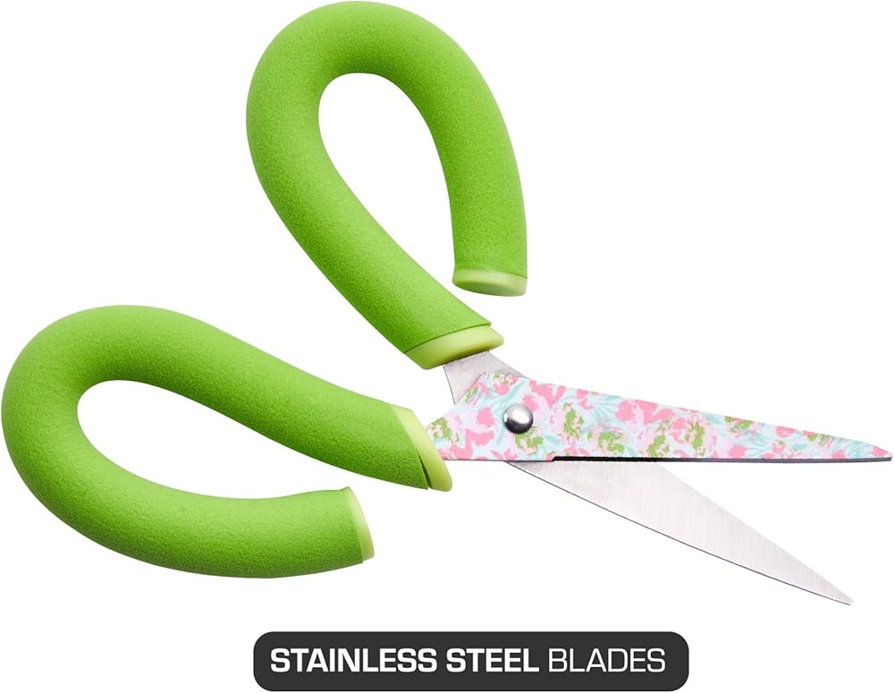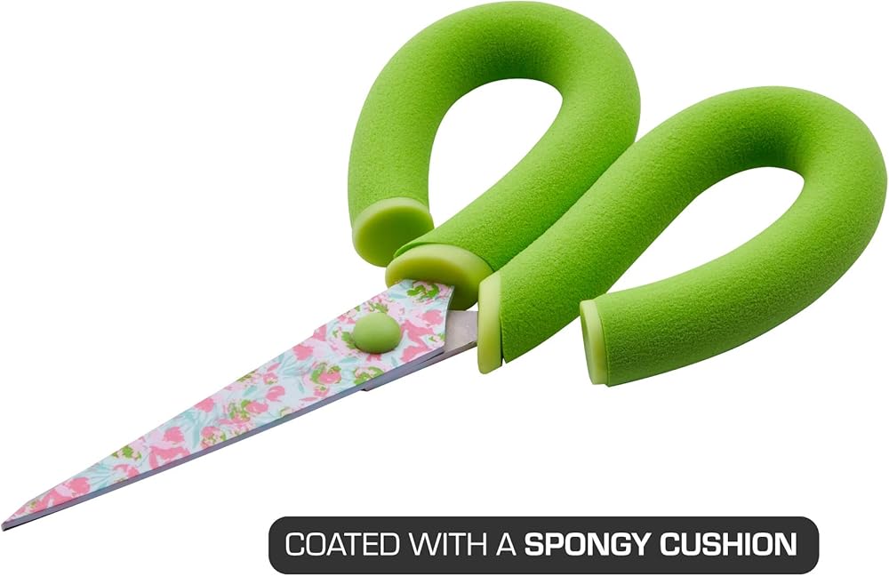 The It's Academic Pillow Grip 8” Scissors, Green with Floral Blades is the perfect pair of ergonomic scissors you've been looking for. The comfort grip is designed for anyone to use! From students to teachers or parents, these pillow grip scissors are designed for any hand size. Say goodbye to cramped hand pain that's caused from normal scissors with hard plastic grips. These scissors are soft to the touch and are ergonomically designed to help hand fatigue. Not only are they soft and easy to hold with a pretty floral design, but the blades are stainless steel and can cut through different types of materials, from notebook paper to art class activity needs, you'll never need another pair of scissors!