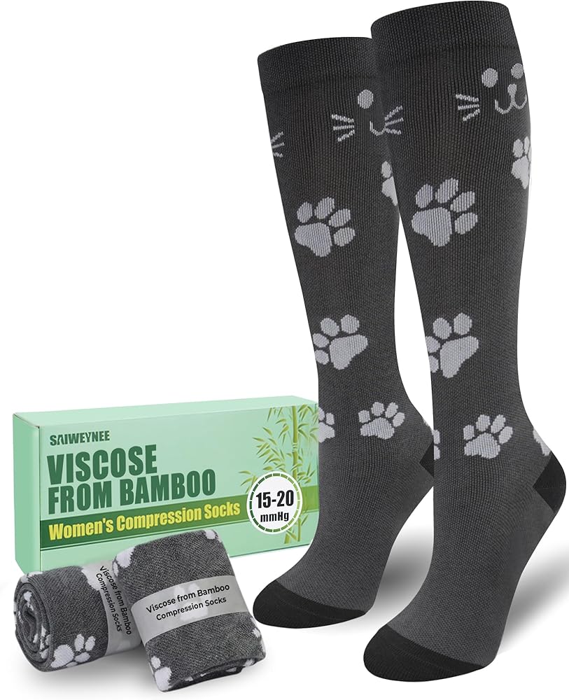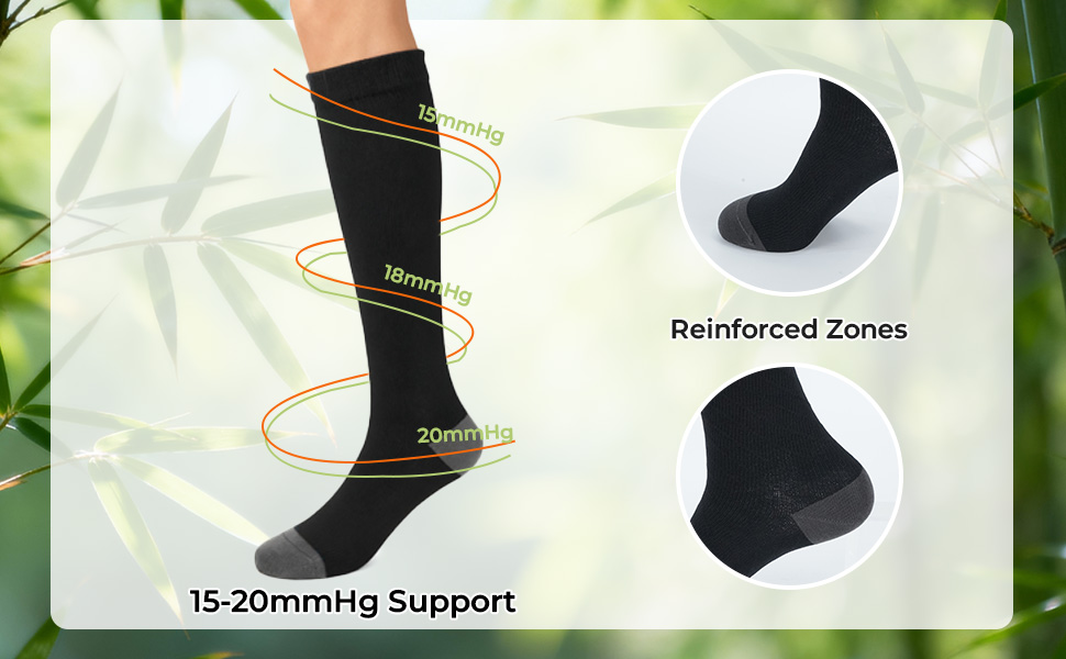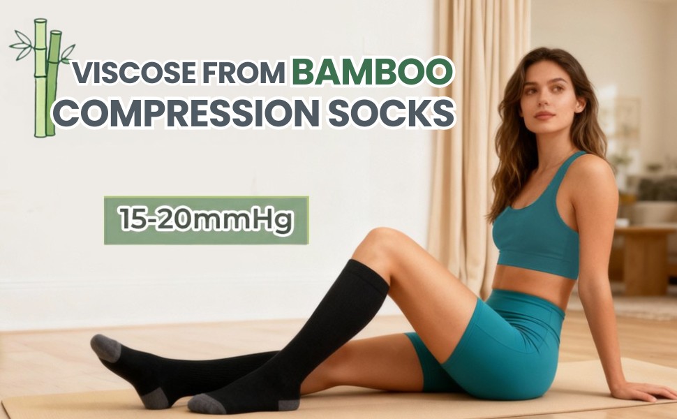 • 1.Viscose from Bamboo for Cloud-Like Comfort: Our compression socks are crafted with high-quality viscose from bamboo, a material specifically chosen for its incredible softness and breathability. This fabric is designed to keep your feet feeling dry and comfortably fresh all day long by allowing air to circulate and managing sweat effectively. It's the gentle hug your feet deserve.