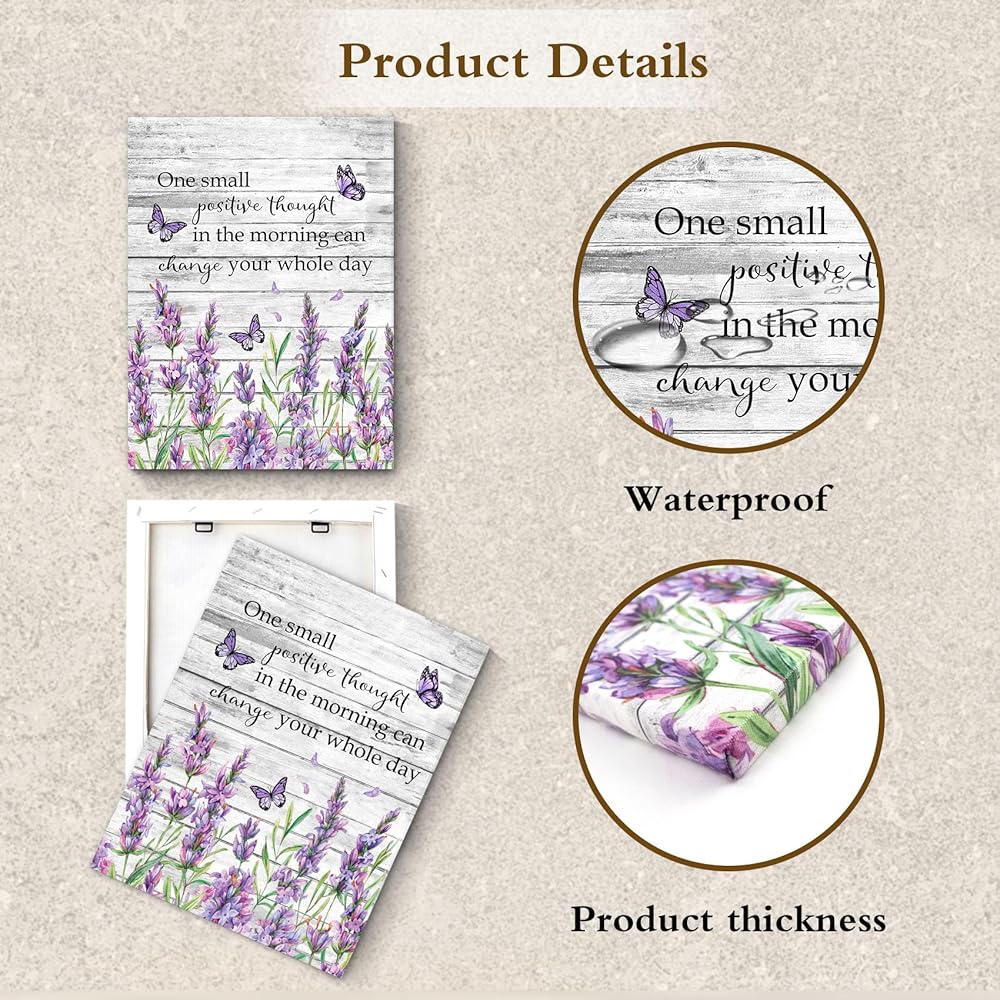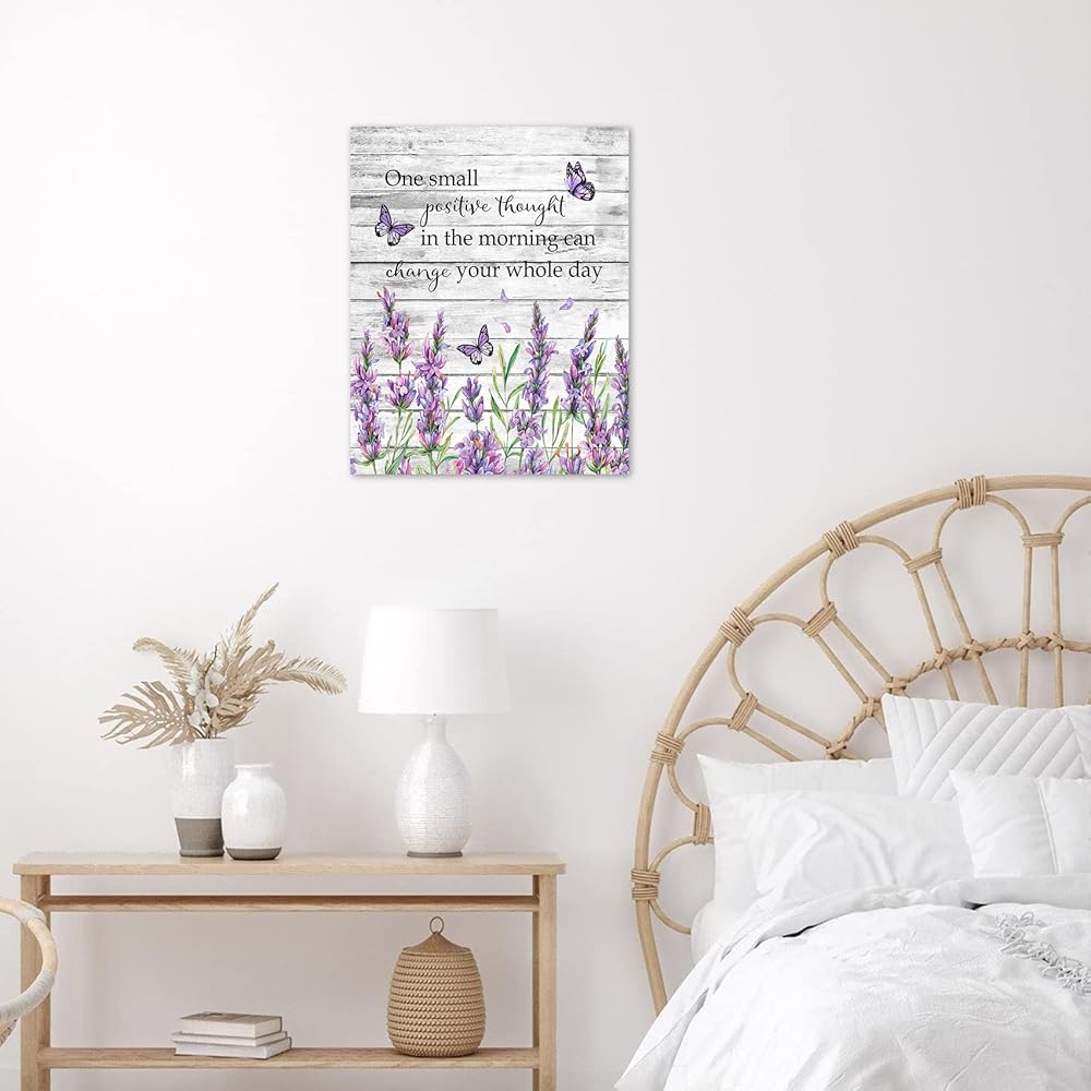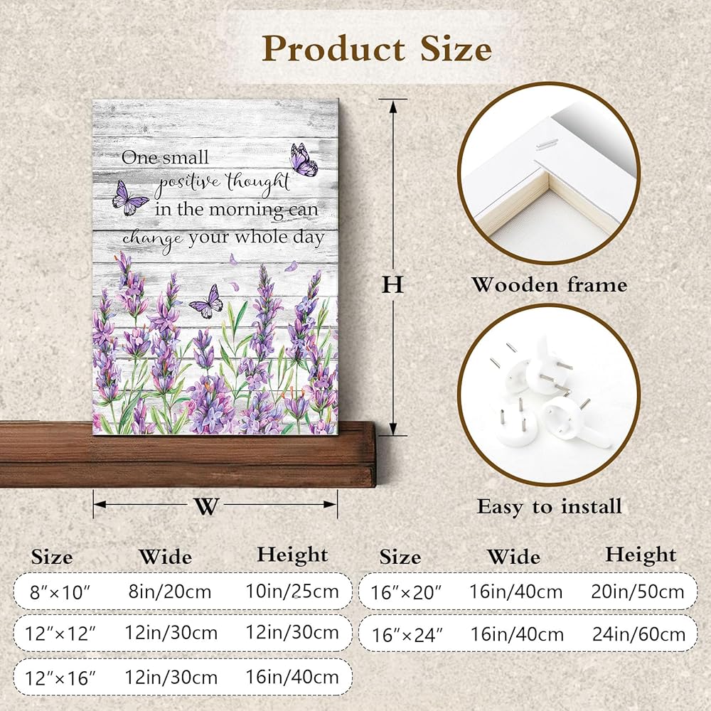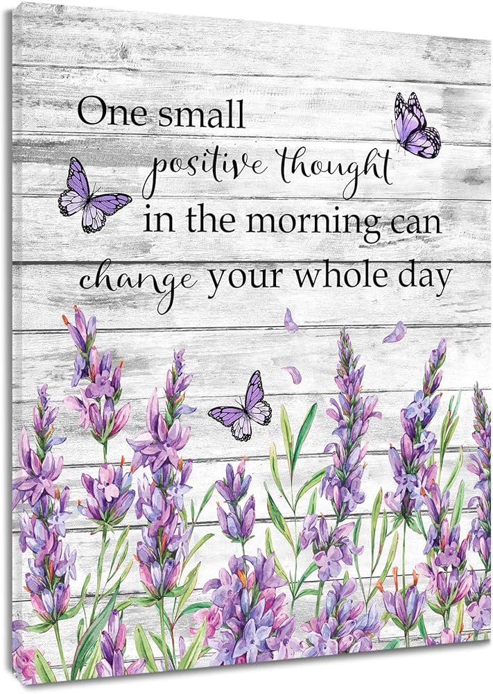 EOBTAIN اقتباسات ملهمة والفراشة الأرجوانية قماش جدار الفن الخزامى الأزهار مع ورقة خضراء جدار الفن للحمام غرفة المعيشة غرفة نوم صورة خمر جدار ديكور مؤطرة غرفة نوم قماش الطباعة، 12 × 16 بوصة