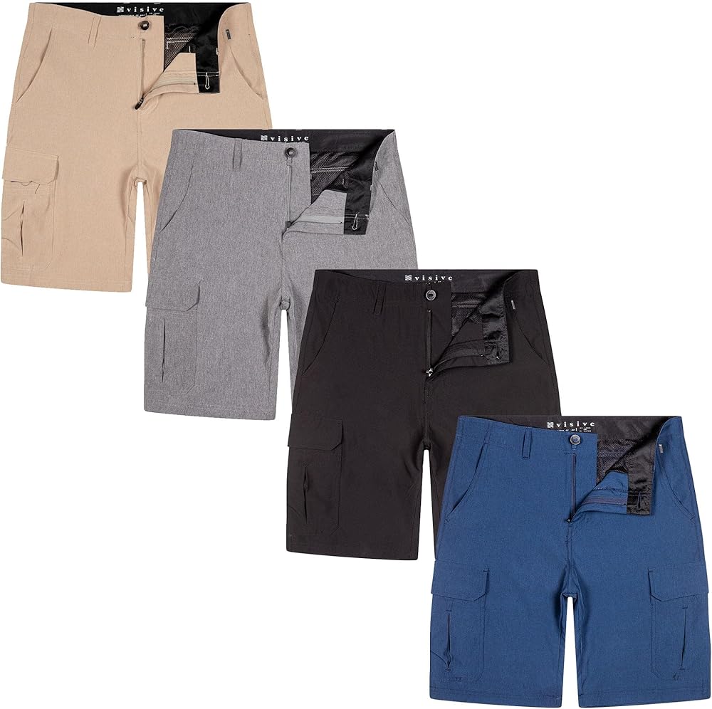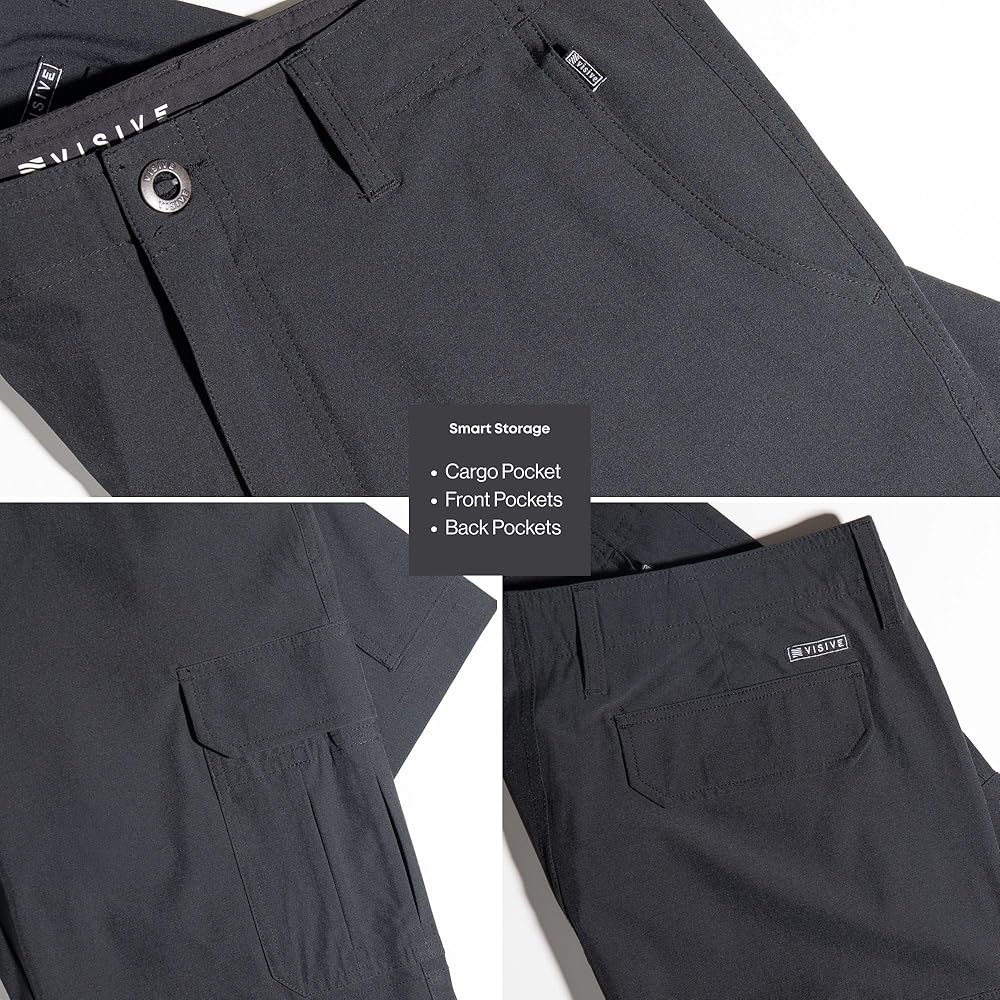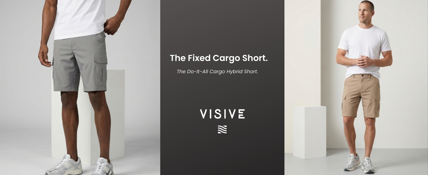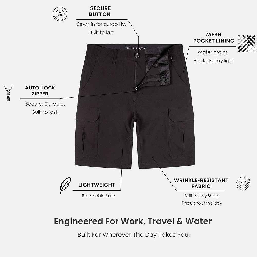 The Modern Hybrid Cargo Short Traditional cargo shorts are bulky and stiff. Swim trunks lack storage and structure. The Visive Hybrid Cargo Short was designed to combine the best of both. Built with a lightweight polyester and spandex performance fabric, these shorts deliver 4-way stretch mobility, quick-dry comfort, and breathable airflow for warm weather. The modern 9-inch inseam creates a clean casual look while maintaining the functionality expected from a cargo short. Secure cargo pockets provide convenient storage for everyday essentials while maintaining a streamlined appearance. Whether you're heading to the golf course, traveling, fishing, hiking, or simply enjoying a summer day outside, these shorts move with you and stay comfortable all day. The performance fabric dries quickly and resists wrinkles, making these a reliable option for travel, outdoor activity, or everyday casual wear. Available in versatile colors including black, navy, grey, and khaki, the Visive Hybrid Cargo Short is built for men who want durability, comfort, and versatility in one modern short.