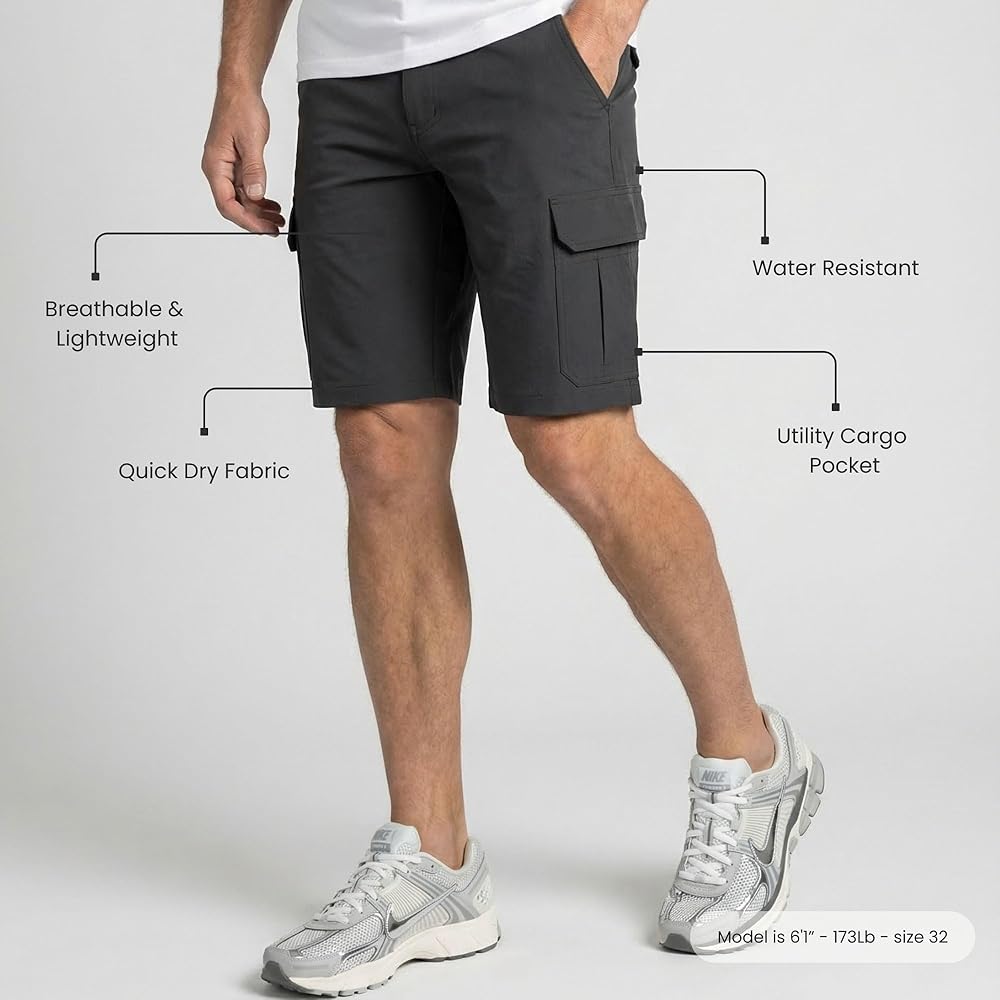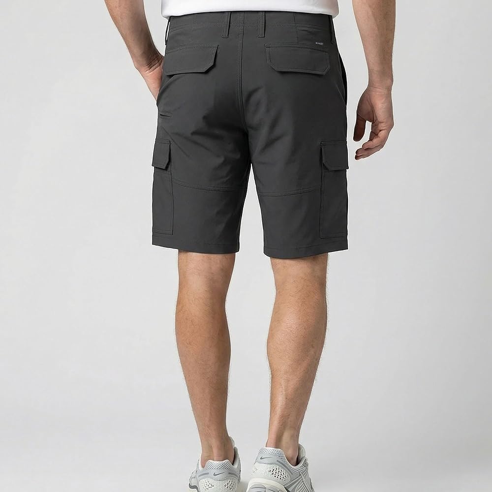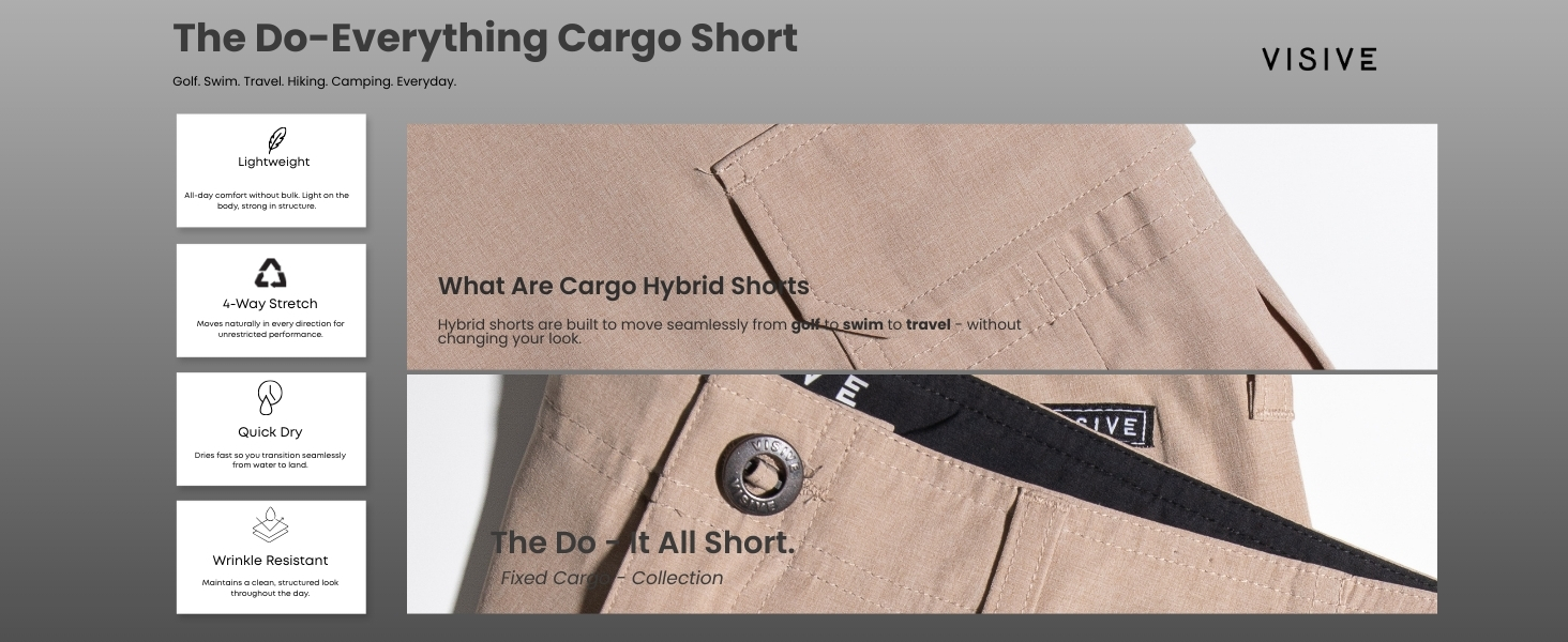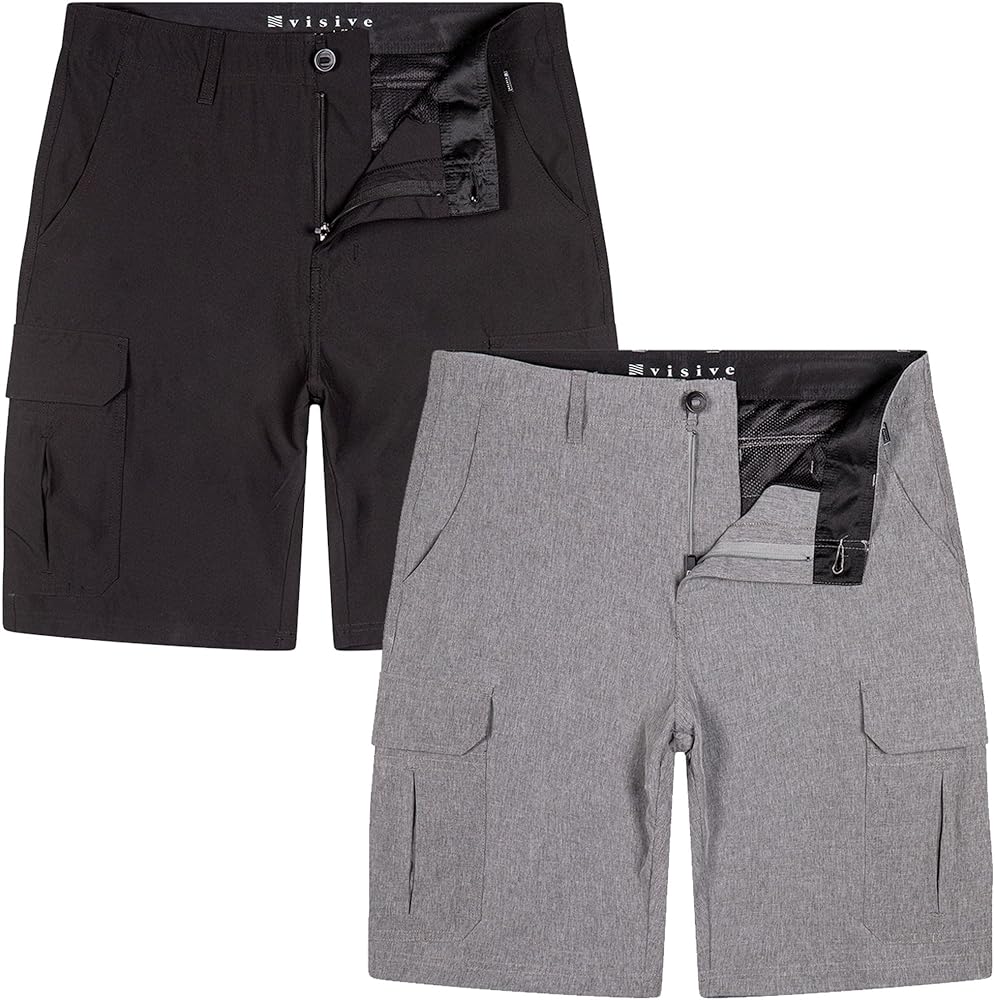 The Modern Hybrid Cargo Short Traditional cargo shorts are bulky and stiff. Swim trunks lack storage and structure. The Visive Hybrid Cargo Short was designed to combine the best of both. Built with a lightweight polyester and spandex performance fabric, these shorts deliver 4-way stretch mobility, quick-dry comfort, and breathable airflow for warm weather. The modern 9-inch inseam creates a clean casual look while maintaining the functionality expected from a cargo short. Secure cargo pockets provide convenient storage for everyday essentials while maintaining a streamlined appearance. Whether you're heading to the golf course, traveling, fishing, hiking, or simply enjoying a summer day outside, these shorts move with you and stay comfortable all day. The performance fabric dries quickly and resists wrinkles, making these a reliable option for travel, outdoor activity, or everyday casual wear. Available in versatile colors including black, navy, grey, and khaki, the Visive Hybrid Cargo Short is built for men who want durability, comfort, and versatility in one modern short.