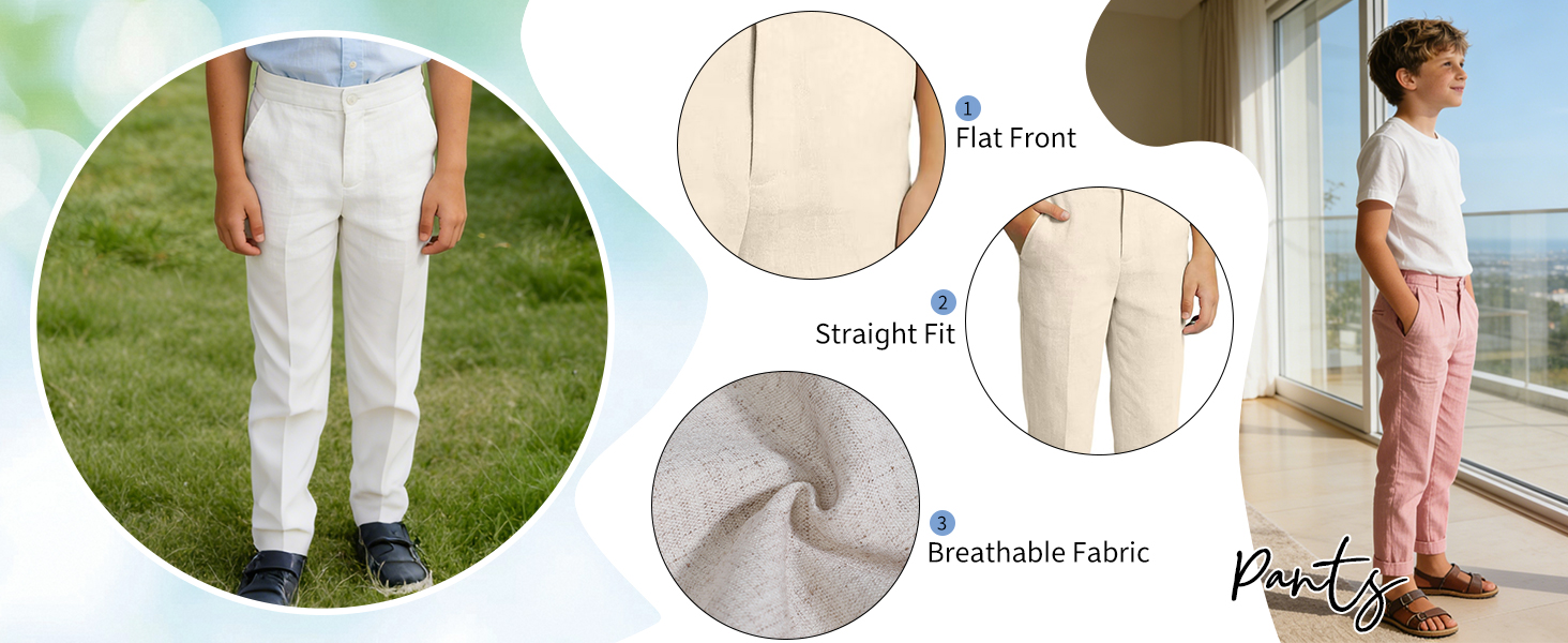نسيج خفيف الوزن وجيد التهوية: مصنوع من مزيج من الكتان المسامي، هذا البنطلون خفيف الوزن للأولاد يبقي طفلك منتعشًا ومرتاحًا طوال اليوم. دع طفلك يركض بحرية حتى في أيام الصيف الحارة. جعل أطفالك أكثر أناقة ووسامة.