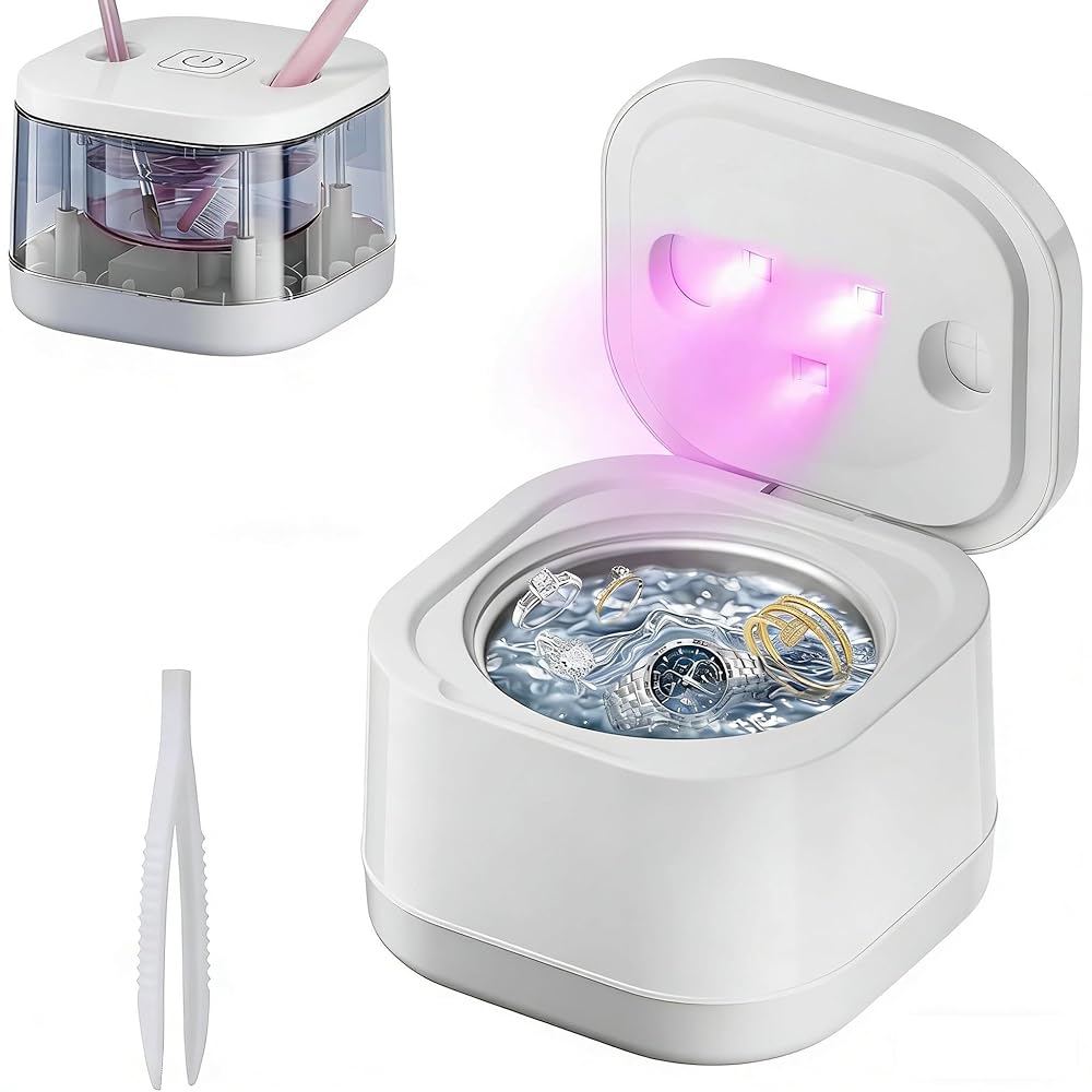 آلة تنظيف حامل بالموجات فوق الصوتية، مناسبة لتنظيف المجوهرات الذهبية والفضية، والمجوهرات، والساعات، والخواتم، ورؤوس فرشاة الأسنان، ومنظف الأشعة فوق البنفسجية بالموجات فوق الصوتية، (45 كيلو هرتز، 200 مل أبيض)