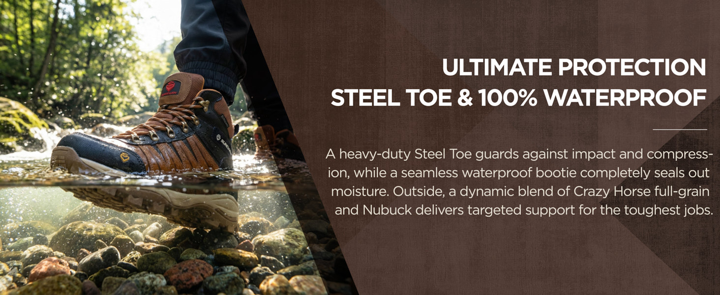 【جلد محبب بالكامل مقاوم للماء】مصنوع من جلد متين محبب بالكامل مع تقنية إغلاق متقدمة مقاومة للماء لحماية 100% من انسكابات الماء والزيوت والسوائل. يحافظ على جفاف القدمين في الظروف القاسية مع الحفاظ على المظهر الاحترافي.