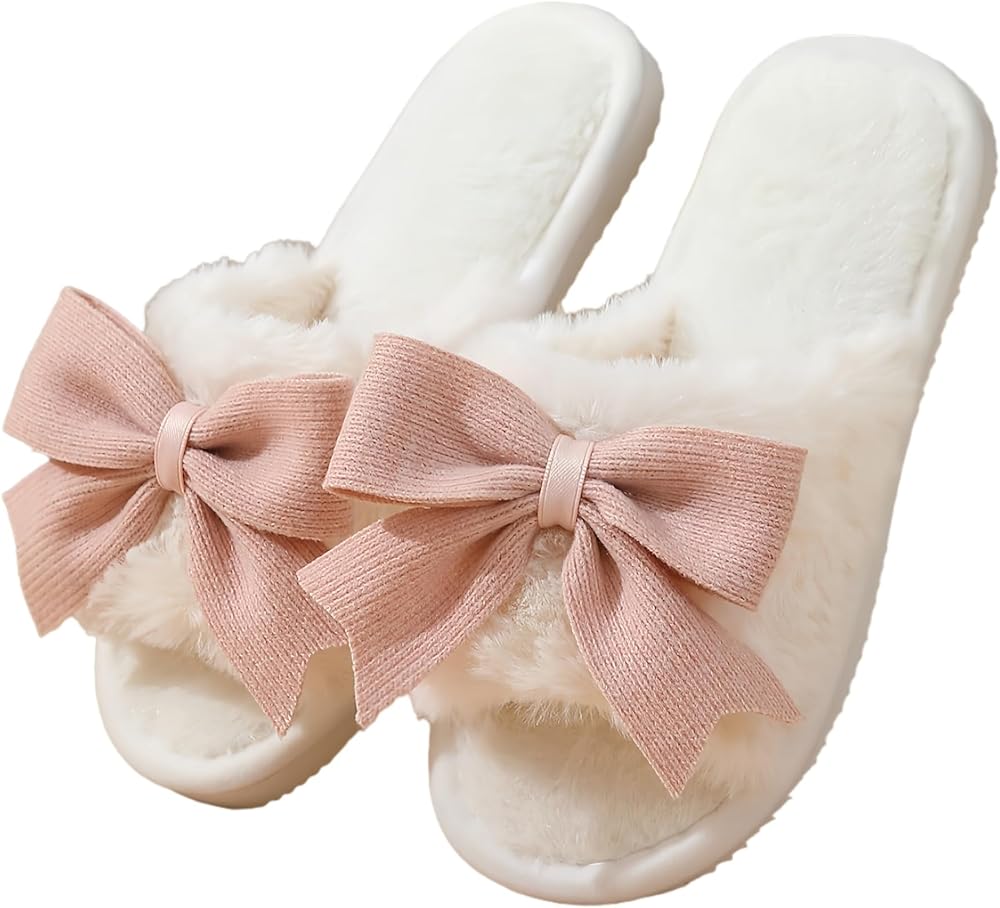 Women's Soft Furry House Slippers with Large Bowknot Plush Memory Foam Indoor Outdoor with Comfortable Flat Sole Ladies