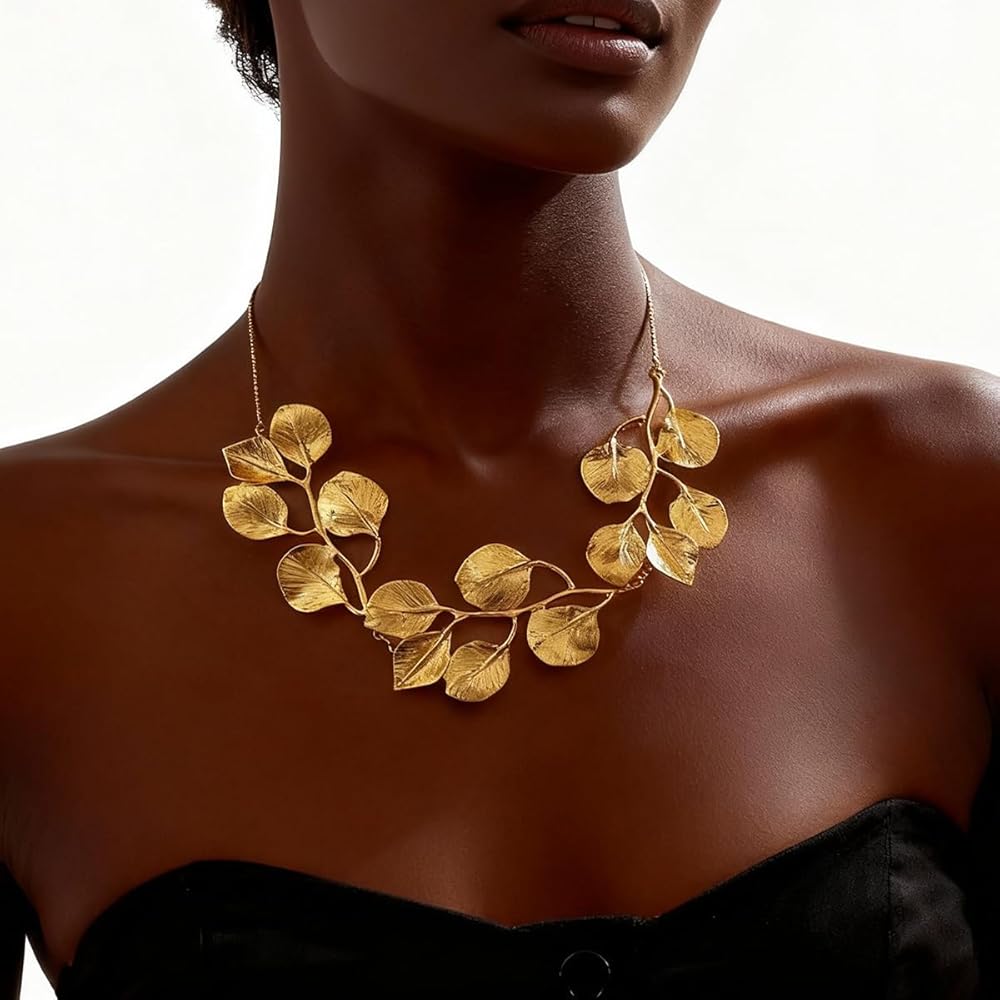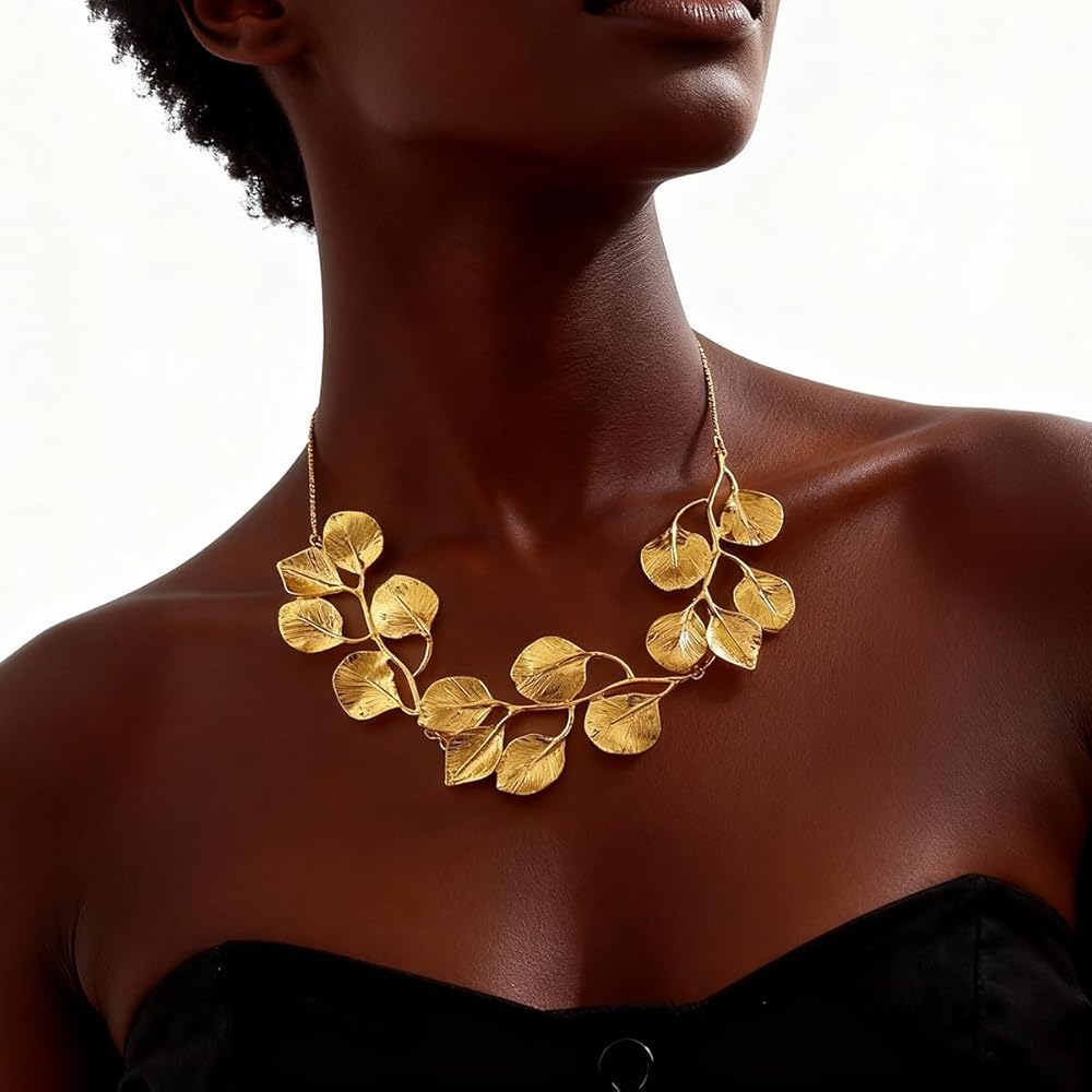 Bold 14k gold plated choker with a striking leaf design, combining boho elegance and African-inspired style. Perfect for making a statement at parties or special events without tarnishing.