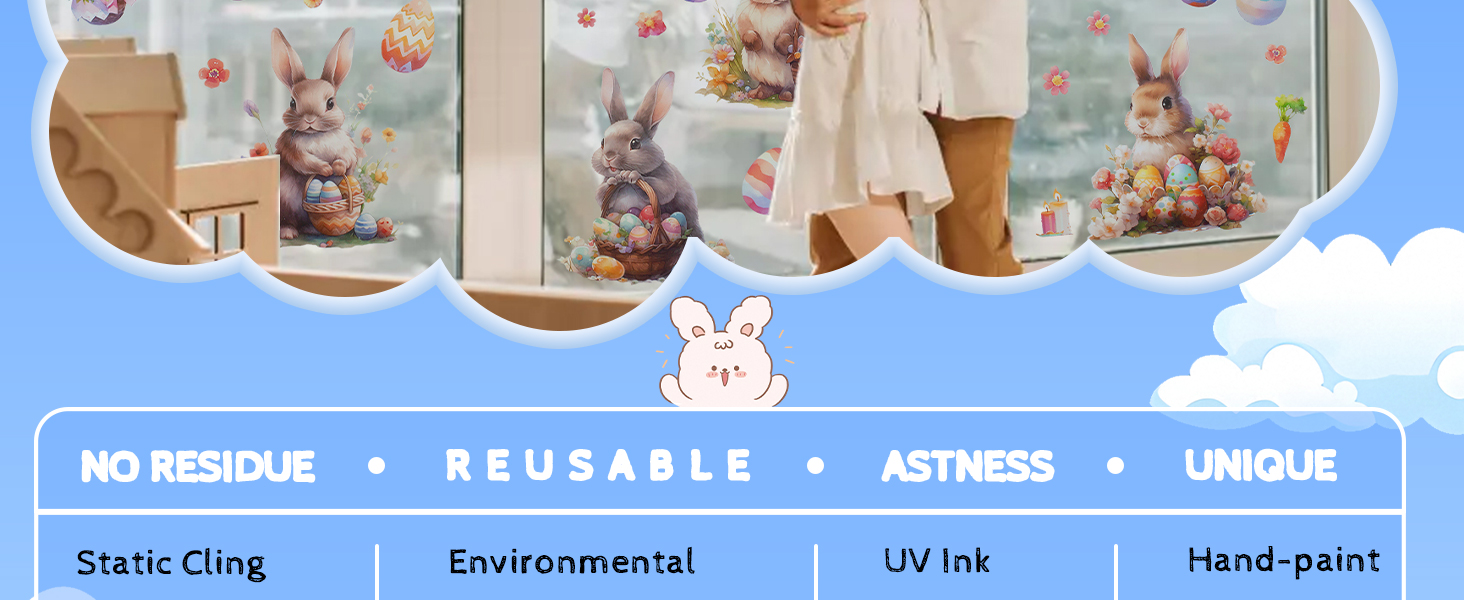 سهلة التركيب والإزالة: لا تحتاج ديكورات ملصقات نافذة عيد الفصح إلى استخدام أي مادة لاصقة، فقط قم بتنظيف السطح وترطيبه، ثم لصق ملصقات عيد الفصح على النافذة. استمتع بتزيين عطلة عيد الفصح بدون قلق حتى عند إعادة وضع التصميمات أو إزالة الزخارف بعد العطلة، تظل نوافذك محفوظة بشكل مثالي