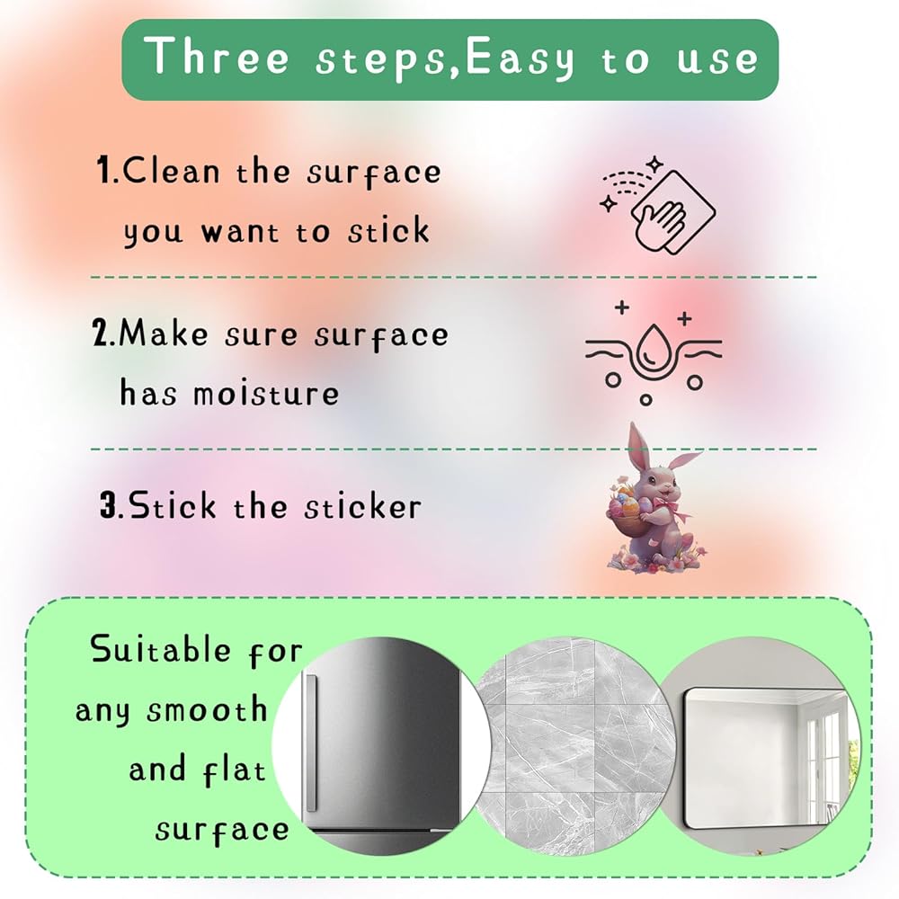 كيفية الاستخدام - ملصقات نافذة عيد الفصح: الخطوة 1 - امسحي الزجاج جيدًا لإزالة الغبار؛ الخطوة 2 - رش الماء النظيف على منطقة التطبيق بأكملها؛ الخطوة 3-فصل ملصقات زينة عيد الفصح عن الورق الخلفي ووضعها على السطح؛ الخطوة 4-استخدم بطاقة لإخراج جيوب فقاعات الماء والهواء من المركز إلى الخارج؛ الخطوة 5-نظف السطح بقطعة قماش جافة