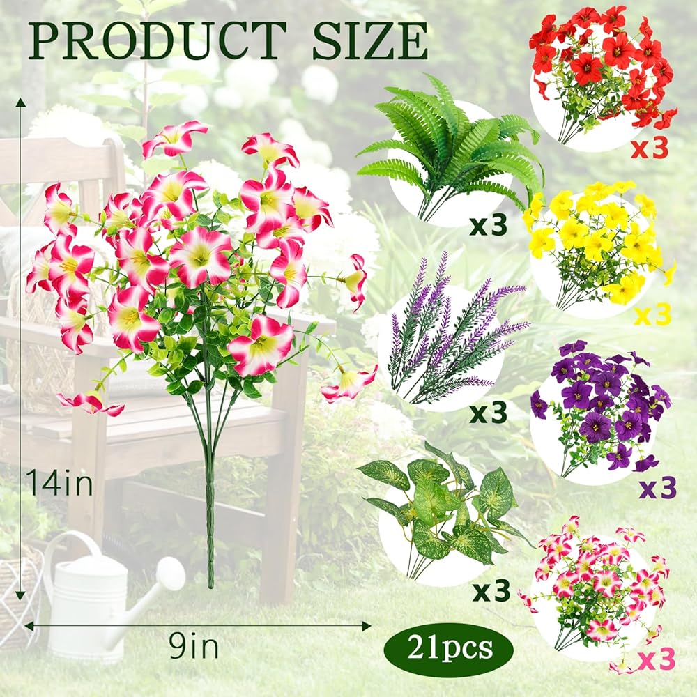 HOHOTIME 21 حزمة من الزهور الاصطناعية في الهواء الطلق، لا تتلاشى الزهور البلاستيكية المزيفة والنباتات الصناعية، مجد الصباح الأوكالبتوس لتعليق المزارعون حديقة الشرفة نافذة صندوق المنزل مزرعة الزفاف