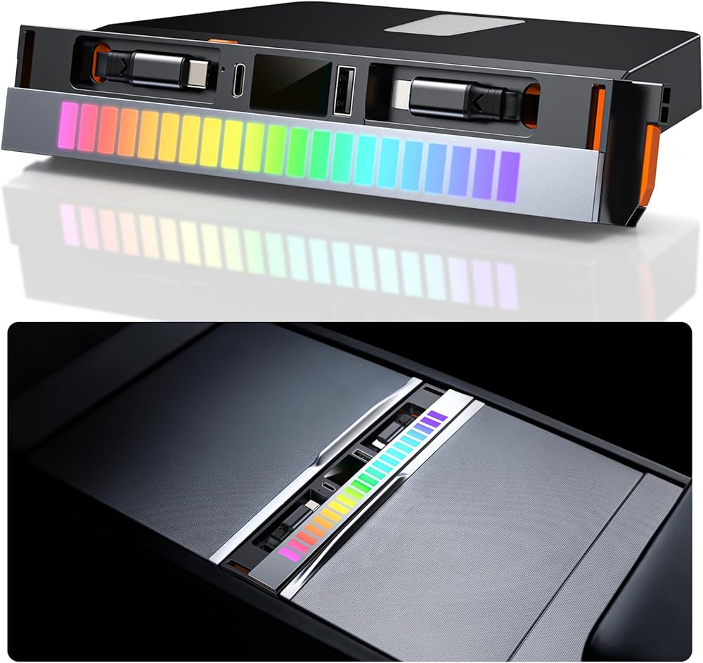 محور USB لـ Tesla Model Y Juniper 2025 2026 Model 3 Highland 2024 2025، 107W RGB محطة إرساء الإضاءة المحيطة مع غطاء منزلق كابل قابل للسحب متعدد المنافذ شاحن سريع مناسب لوحدة التحكم المركزية