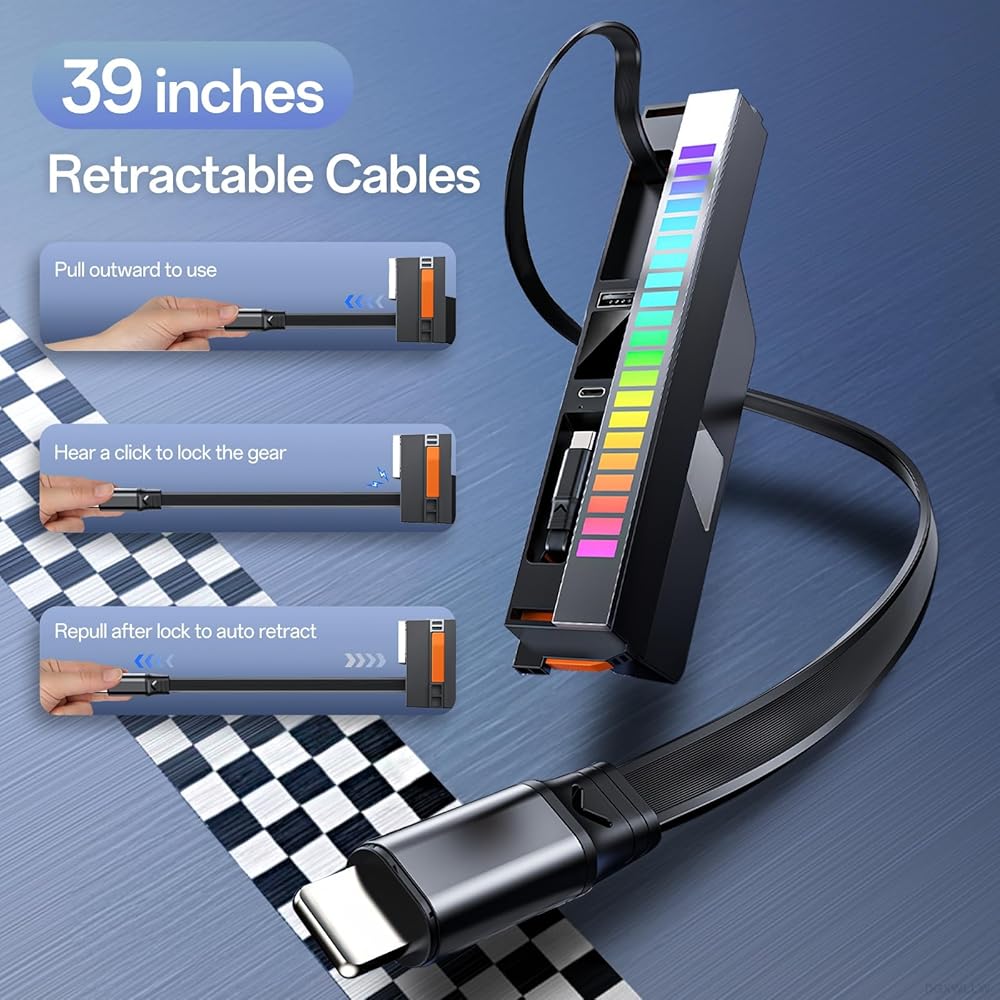 شحن سريع إجمالي 107 واط و4 منافذ: يتميز مركز الشحن هذا بكابل قابل للسحب من النوع C بقدرة 65 واط يدعم 5 فولت/3 أمبير، 9 فولت/2 أمبير، 12 فولت/3 أمبير، 15 فولت/3 أمبير، و20 فولت/3.25 أمبير، بالإضافة إلى كابل قابل للسحب 27 واط لهاتف iPhone الذي يدعم الشحن السريع 5 فولت/3 أمبير و9 فولت/3 أمبير. ويتضمن أيضًا منفذ USB-A بقدرة 12 واط (5 فولت/2.4 أمبير) ومنفذ USB-C بقدرة 15 واط (5 فولت/3 أمبير). تدعم جميع المنافذ الشحن السريع بشكل فردي أو في نفس الوقت، بإجمالي خرج يصل إلى 107 واط. متوافق مع الهواتف الذكية والأجهزة اللوحية وسماعات الأذن والأجهزة الأخرى