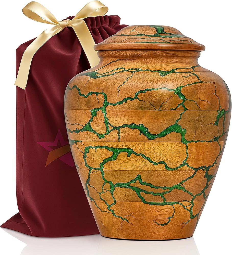 Preserve the memory of your loved one with this Handmade Wooden Cremation Urn for Adult Ashes by Bhartiya Handicrafts. Expertly crafted from premium solid mango wood with a striking green epoxy inlay, this urn symbolizes eternal love, peace, and dignity. Each urn is carefully handmade, ensuring a unique design that serves as both a memorial and a decorative tribute.