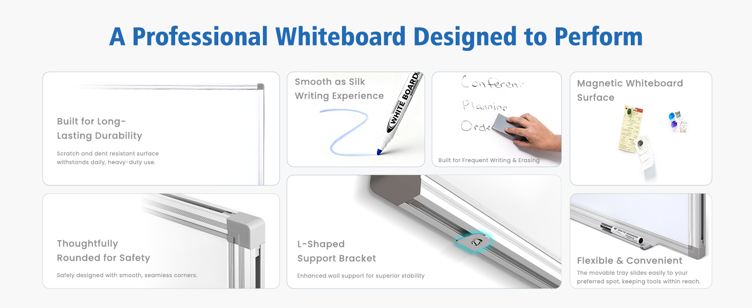 كتابة سلسة وسهلة المسح: استمتع بالكتابة السلسة والتنظيف دون عناء على لوحة المسح الجاف المغناطيسية الممتازة هذه. سواء كنت تحدد الاستراتيجيات في اجتماع شركة أو تقوم بالتدريس في المدرسة، فإن سطح المسح الجاف للسبورة البيضاء هذا يوفر الوضوح والدقة لتعزيز التواصل.