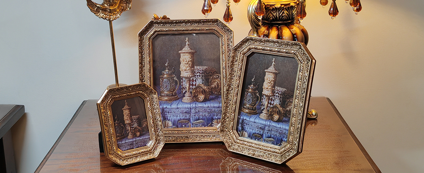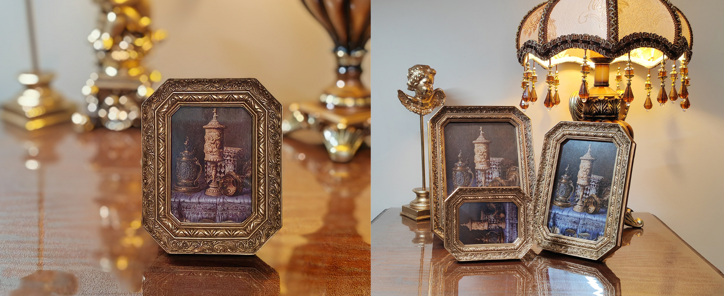 جودة ممتازة وحرفية حرفية: كل إطار صورة عتيق مصنوع من الراتنج المتين ومطلي بالبرونز مع مظهر عتيق من خلال الرسم اليدوي متعدد الطبقات. تحمي الواجهة الزجاجية عالية الدقة ذكرياتك من الغبار والخدوش، بينما يضيف الجزء الخلفي المخملي الأسود الفاخر مزيدًا من الحماية والرقي.
