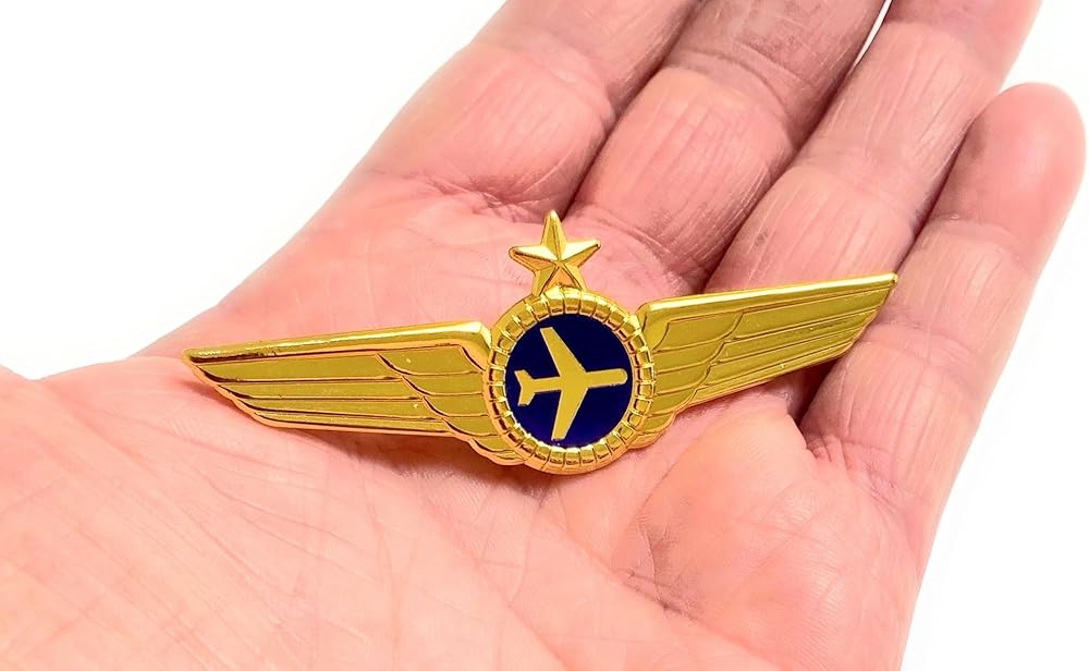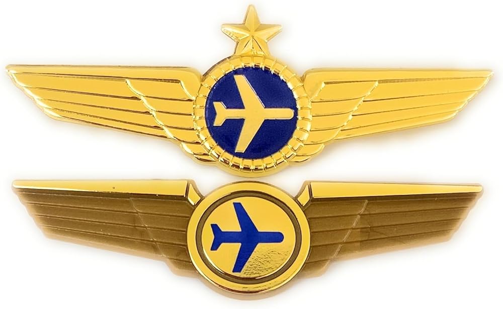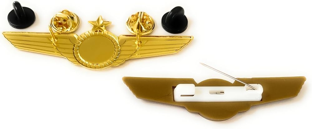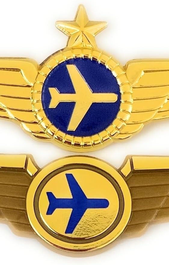 • 1 دبوس أجنحة معدنية لقائد الطائرة الجوية + 1 دبوس أجنحة بلاستيكي ذهبي صغير