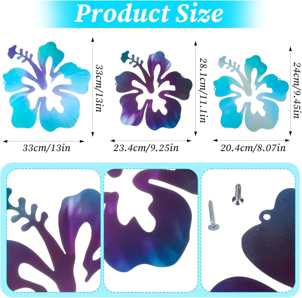 Suitable Size for Fit: metal hibiscus decor designed with consideration to your space, these tropical wall decorations are in sizes 12.99 x 11.10 inches, 10.83 x 9.25 inches and 9.45 x 8.07 inches, 3 different size Hawaiian metal wall art. They will fit without crowding your wall; Their ideal size makes them a suitable decor piece for your living room, kitchen, bedroom or porch.