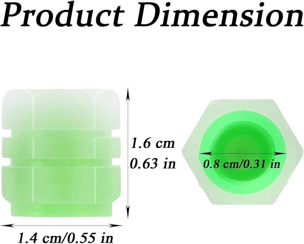 • Size and Color - The diameter of glowing tire air caps is 0.55 in/1.4 cm, and the height is 0.63 in/1.6 cm. The package include 40 pcs, five colors are pink, red, green, yellow, blue.