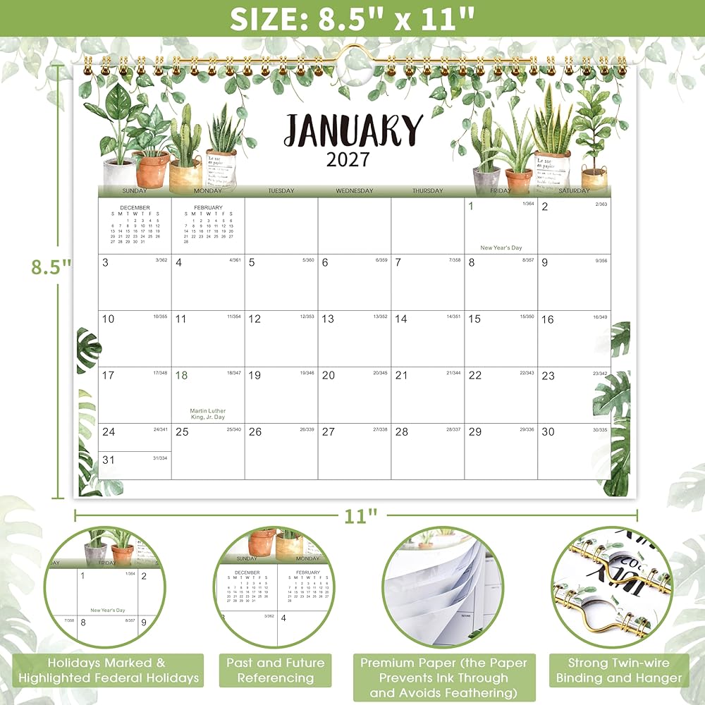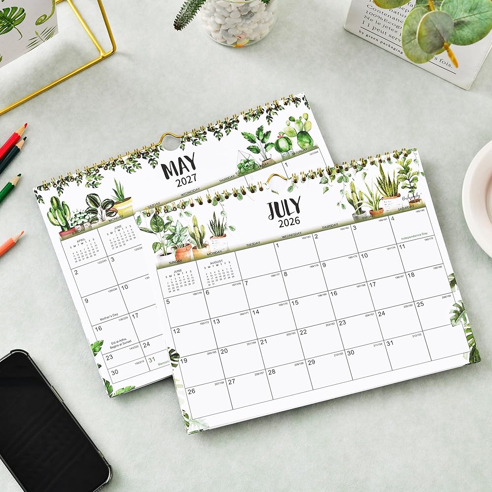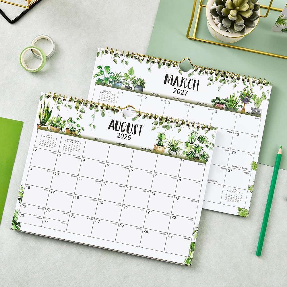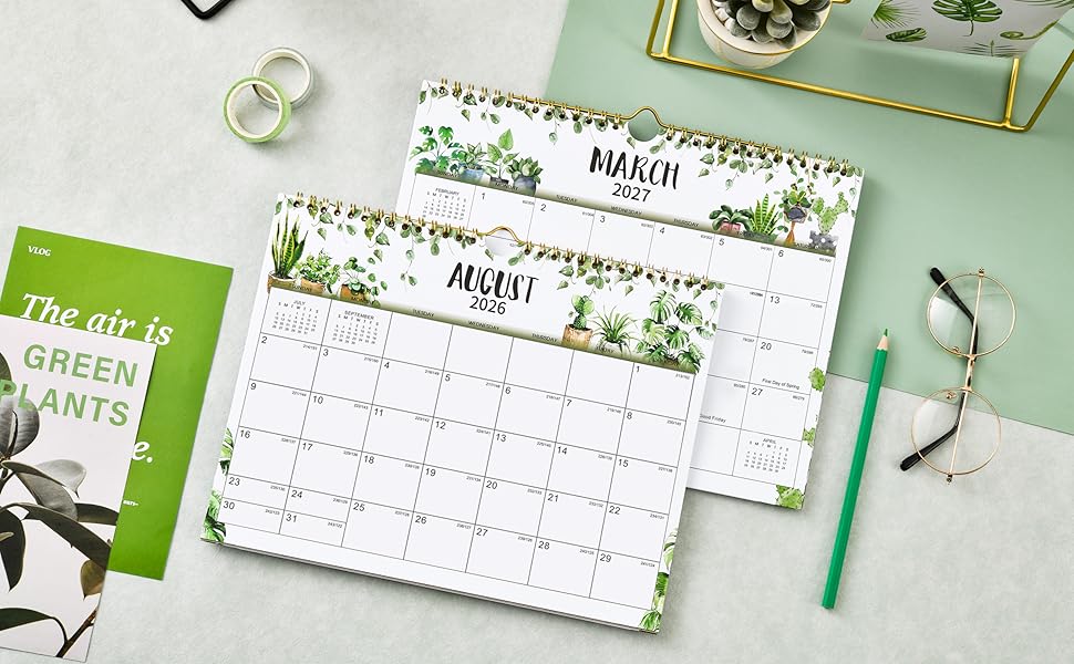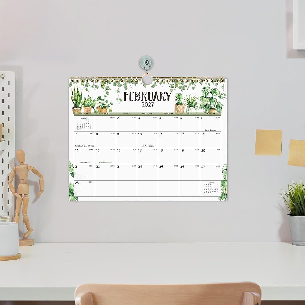 جودة عالية - صفحات أكثر سمكًا من تقويم الحائط العادي 2026-2027 في السوق لتقليل تسرب الحبر ومحو الاهتراء ومشاكل الظل + ورق أبيض ساطع لخلق مساحة كتابة نظيفة وحماية البيئة + مطبوع باستخدام حبر ملون عالي الجودة ومتوازن جيدًا.