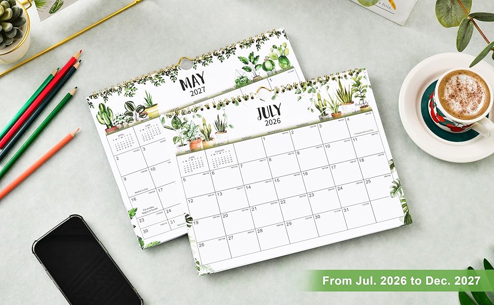 تفاصيل عملية - ربط قوي بسلك مزدوج لقلب صفحات التقويم بسهولة + خطاف تعليق لتعليق التقويم بمرونة + غطاء خلفي صلب لحماية تقويمك 2026-2027 جيدًا + ألوان حبر مختلفة لكل شهر.
