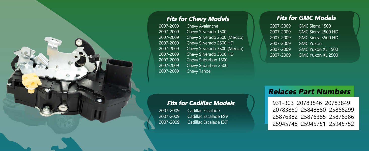 تركيب السيارة 2: محرك تشغيل قفل الباب هذا متوافق مع موديلات تشيفي: 2007-2009 تشيفي أفالانش، 2007-2009 تشيفي سيلفرادو 1500، 2007-2009 تشيفي سيلفرادو 2500 (المكسيك)، 2007-2009 تشيفي سيلفرادو 2500 HD، 2007-2009 تشيفي سيلفرادو 3500 (المكسيك)، 2007-2009 تشيفي سيلفرادو 3500 HD، 2007-2009 تشيفي سوبربان 1500، 2007-2009 تشيفي سوبربان 2500، 2007-2009 تشيفي تاهو.